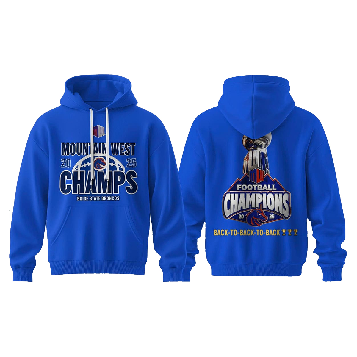 This hoodie features a vibrant Boise-blue base with bold championship artwork on both the front and back. The front design showcases “Mountain West Champs 2025” framed by a football graphic and the iconic Broncos logo, giving the hoodie an instantly recognizable and energetic look. On the back, the artwork grows even more powerful, displaying a towering championship trophy above a large “Football Champions 2025” emblem. Below the crest, the phrase “Back-to-Back-to-Back” is highlighted with three trophy icons, honoring Boise State’s rare and remarkable conference three-peat. The clean typography, striking colors, and balanced design bring the spirit of championship weekend directly into the apparel.
