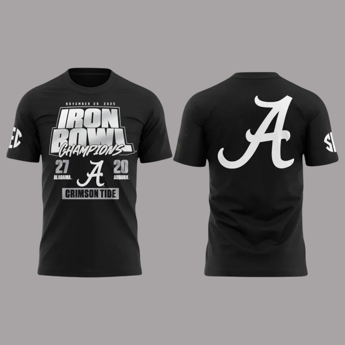 This commemorative shirt showcases a powerful front layout featuring the “Iron Bowl Champions” headline, the exact score, and the date, making it instantly recognizable to anyone who followed the iconic matchup. The large script “A” displayed on both sides adds a timeless flair, giving the shirt a clean and confident identity. Designed to echo the energy of the 2025 battle, this tee blends sporty aesthetics with fan pride in a way that stands out at tailgates, campus events, game-day gatherings, or everyday outfits.