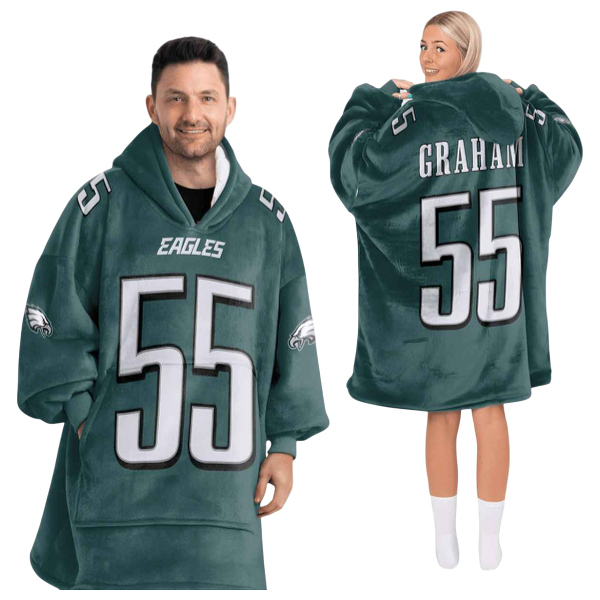 This hoodie blanket features a deep midnight-green color inspired by the team’s iconic uniform. The front showcases a large, detailed “55” across the chest, along with “EAGLES” lettering at the neckline and team wing graphics on each sleeve. The oversized fit creates a cozy, draped silhouette, perfect for snuggling up during cold weather. On the back, the bold “GRAHAM 55” lettering stands out beautifully, giving the hoodie a jersey-style look while maintaining the plush feel of a blanket. The design captures the spirit of Philadelphia football culture tough, passionate, and loyal, making it a must-have for devoted fans.