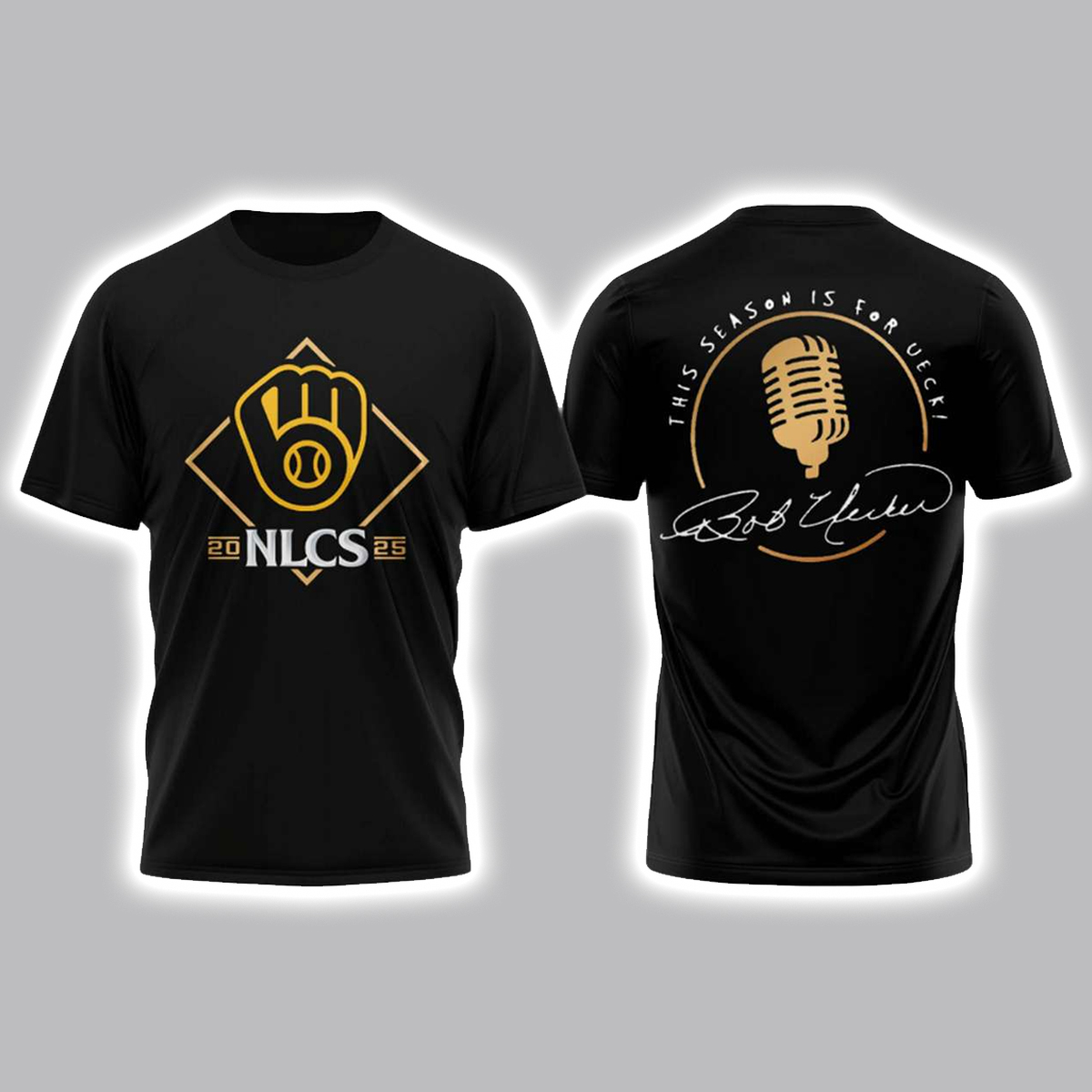 The Brewers 2025 NLCS Shirt features a sleek, modern design with a gold-outlined classic glove logo on the front, placed inside a diamond graphic with the year 2025 and NLCS emblazoned in the center. The back showcases a vintage microphone and a bold message This Season Is For Ueck a heartfelt tribute to the iconic voice of baseball, Bob Uecker. His signature adds an authentic, commemorative touch that makes this shirt more than just a fan item it’s a salute to the spirit and legacy of Brewers baseball.