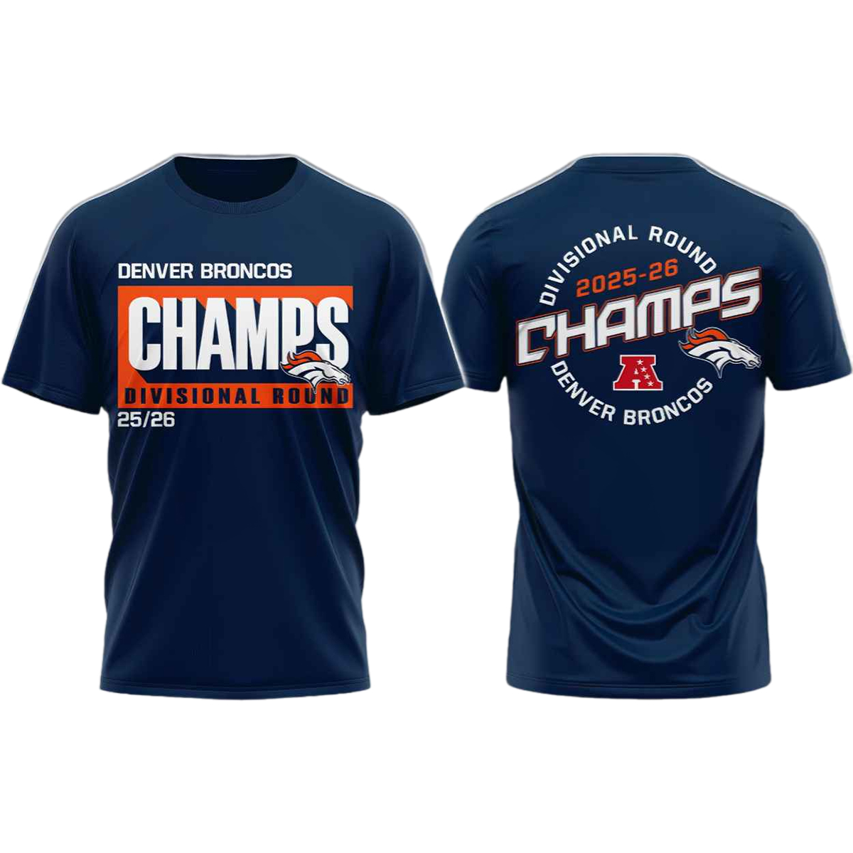 The Broncos Champs Division Round 25 26 Shirt features a clean, powerful layout designed to highlight the achievement without distraction. The front displays bold championship typography paired with strong color contrast, instantly drawing attention to the “Champs” message and the 25/26 season mark. The back design expands on that story, showcasing a circular championship-style graphic that reinforces the division round victory and gives the shirt a balanced, premium look from every angle.
