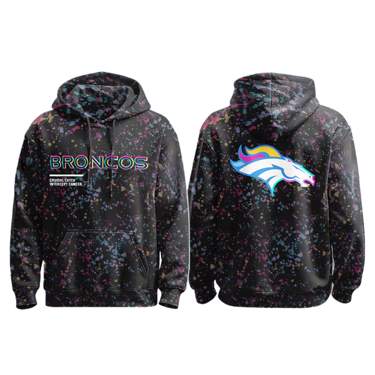 The Broncos Crucial Catch 2025 Hoodie features an eye-catching, unique black base accented with a multi-colored splatter design that echoes the diverse spectrum of those affected by cancer. On the front, the bold BRONCOS text, rendered in a dynamic, multi-color gradient, sits above the powerful message: CRUCIAL CATCH INTERCEPT CANCER. This phrasing connects the spirit of the game the crucial play, the interception with the mission to tackle cancer head-on.