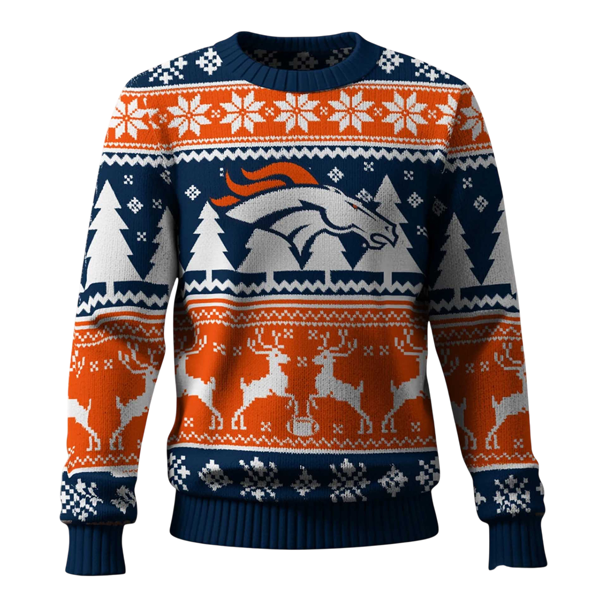 The Broncos Reindeer Football Christmas Ugly Sweater shines in a striking combination of navy blue, orange, and white a palette that perfectly captures both winter joy and team energy. The galloping horse emblem takes center stage, surrounded by festive motifs of snowflakes, pine trees, and reindeer locking antlers over a football. Every knitted detail feels rich and nostalgic, blending vintage craftsmanship with a modern twist. It’s the ultimate expression of holiday spirit, confidence, and love for the game.