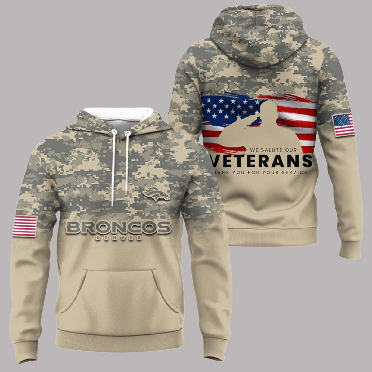 The Broncos We Salute Our Veterans 2025 Hoodie draws inspiration from annual military appreciation traditions held to recognize those who have served. The camouflage pattern reflects dedication and readiness, while the saluting figure on the back represents respect and acknowledgment. The American flag elements tie the entire concept together, symbolizing unity and shared values. This design was created to resonate not only with supporters of the Broncos name but also with anyone who wants to visibly honor veterans in a tasteful, respectful way.