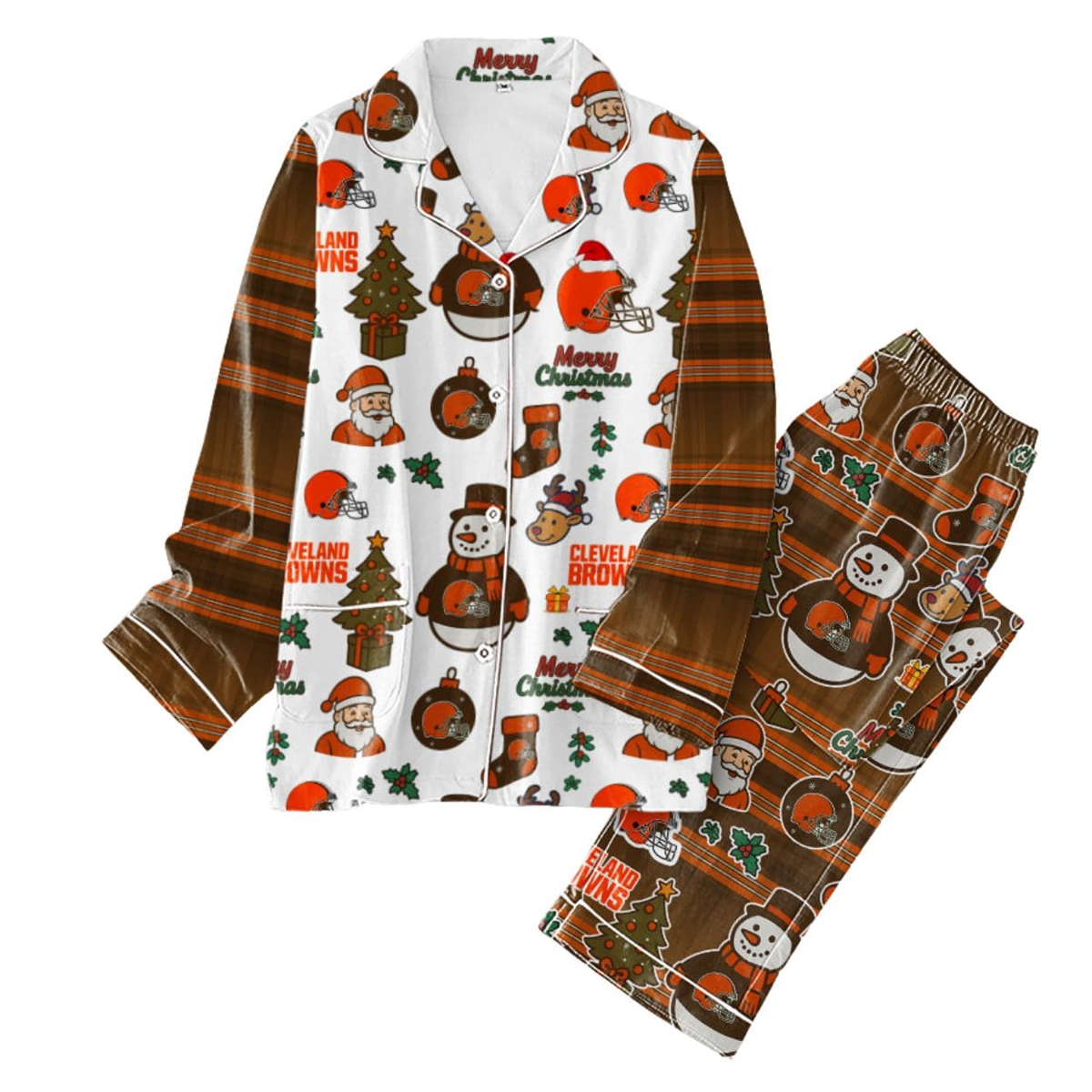 The design features a delightful mix of Christmas icons and football-themed illustrations, making the set visually fun from top to bottom. The pajama top has a clean white background decorated with Santa faces, Christmas trees, snowmen, gift boxes, holly leaves, stockings, and adorable reindeer heads. Mixed among these festive symbols are football helmets, ornaments, and repeated “CLEVELAND BROWNS” text in a bold orange hue that stands out beautifully against the winter palette. Meanwhile, the sleeves bring a warm and rustic touch with their brown plaid pattern, adding a classic winter feel that balances the bright holiday artwork.