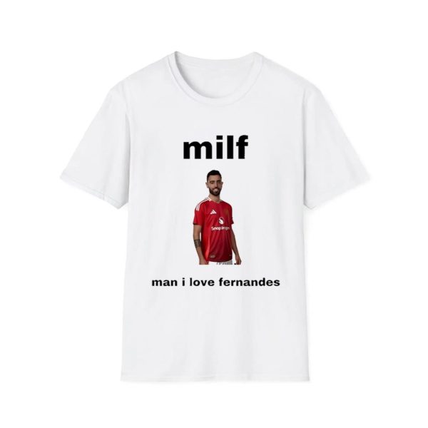This eye-catching white tee features the bold, black text “MILF” across the chest immediately grabbing attention. But before anyone jumps to conclusions, the joke is revealed below: “man I love Fernandes,” accompanied by an image of Bruno Fernandes himself, proudly donning his Man United kit. It’s a cheeky design that merges internet humor with football passion.