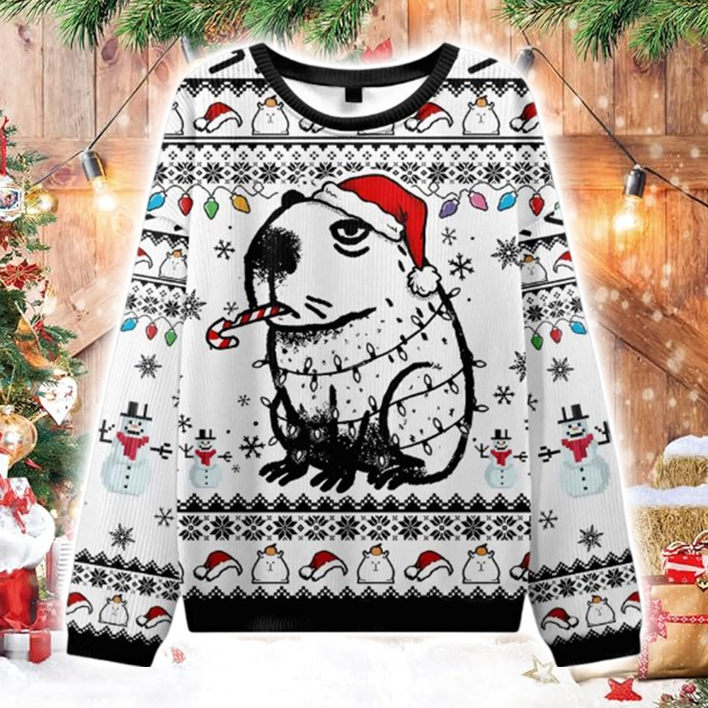 At the heart of this sweater is one unimpressed, candy cane smoking capybara wearing a tangled string of lights and a Santa hat, looking like it’s been through one too many holiday parties and honestly, we can all relate.