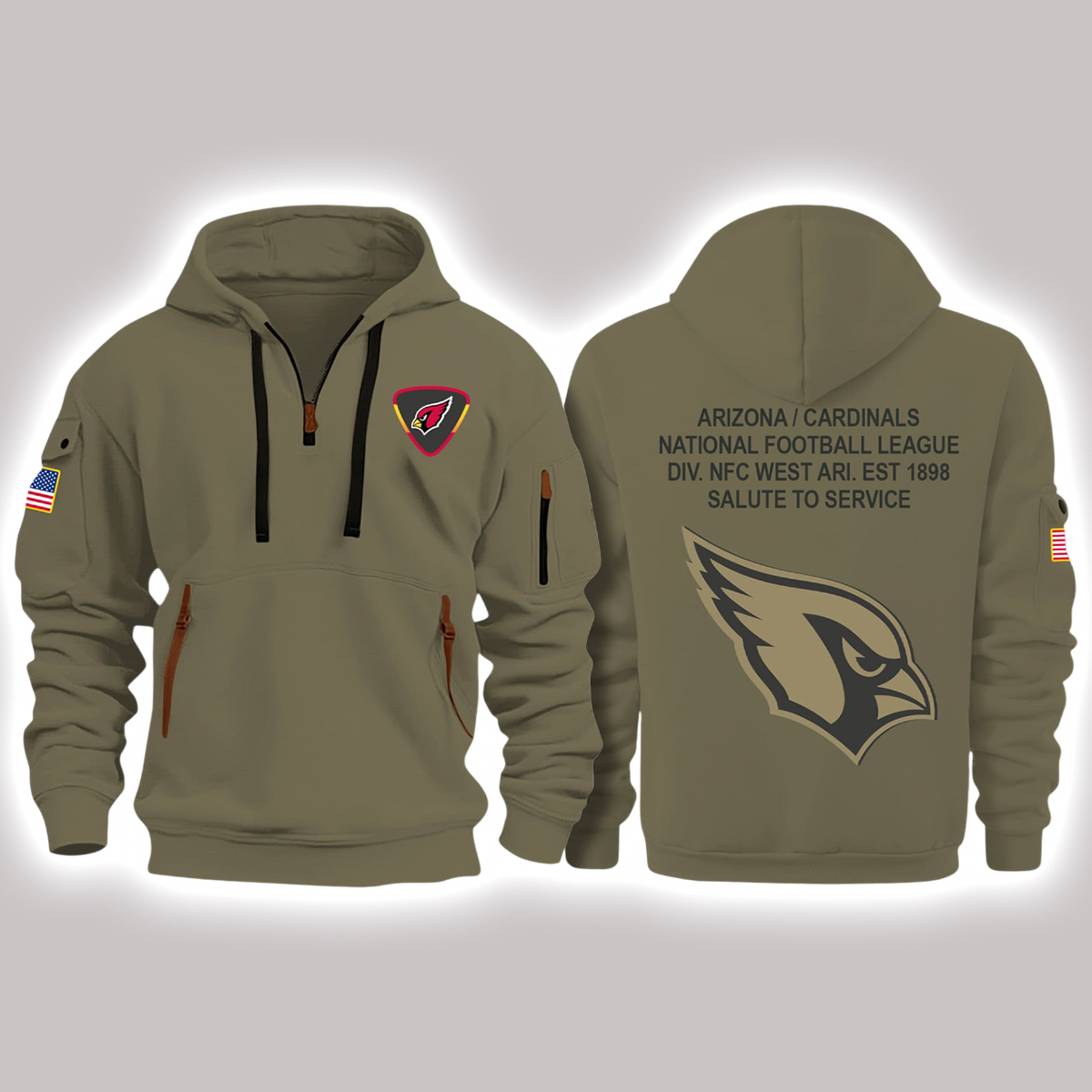 Crafted in a tactical olive tone, this quarter-zip hoodie features a structured, military-inspired silhouette with brown zipper accents that give it a bold utilitarian edge. The front chest proudly displays the iconic red bird logo over a shield patch, while the back showcases large block text reading “Arizona / Cardinals Salute To Service.” Subtle sleeve details include an American flag patch and functional arm pocket zippers, adding both authenticity and everyday practicality.