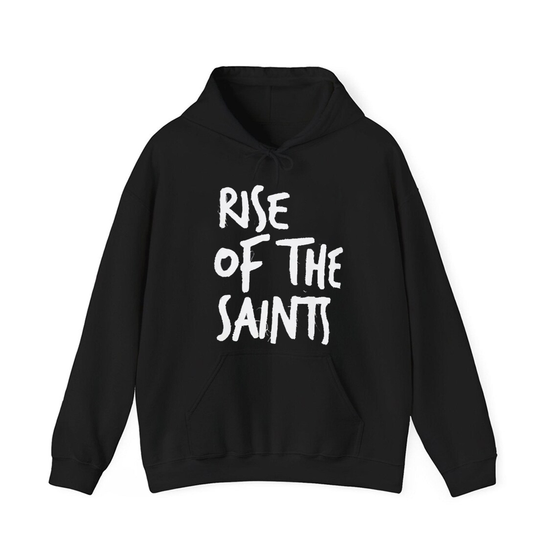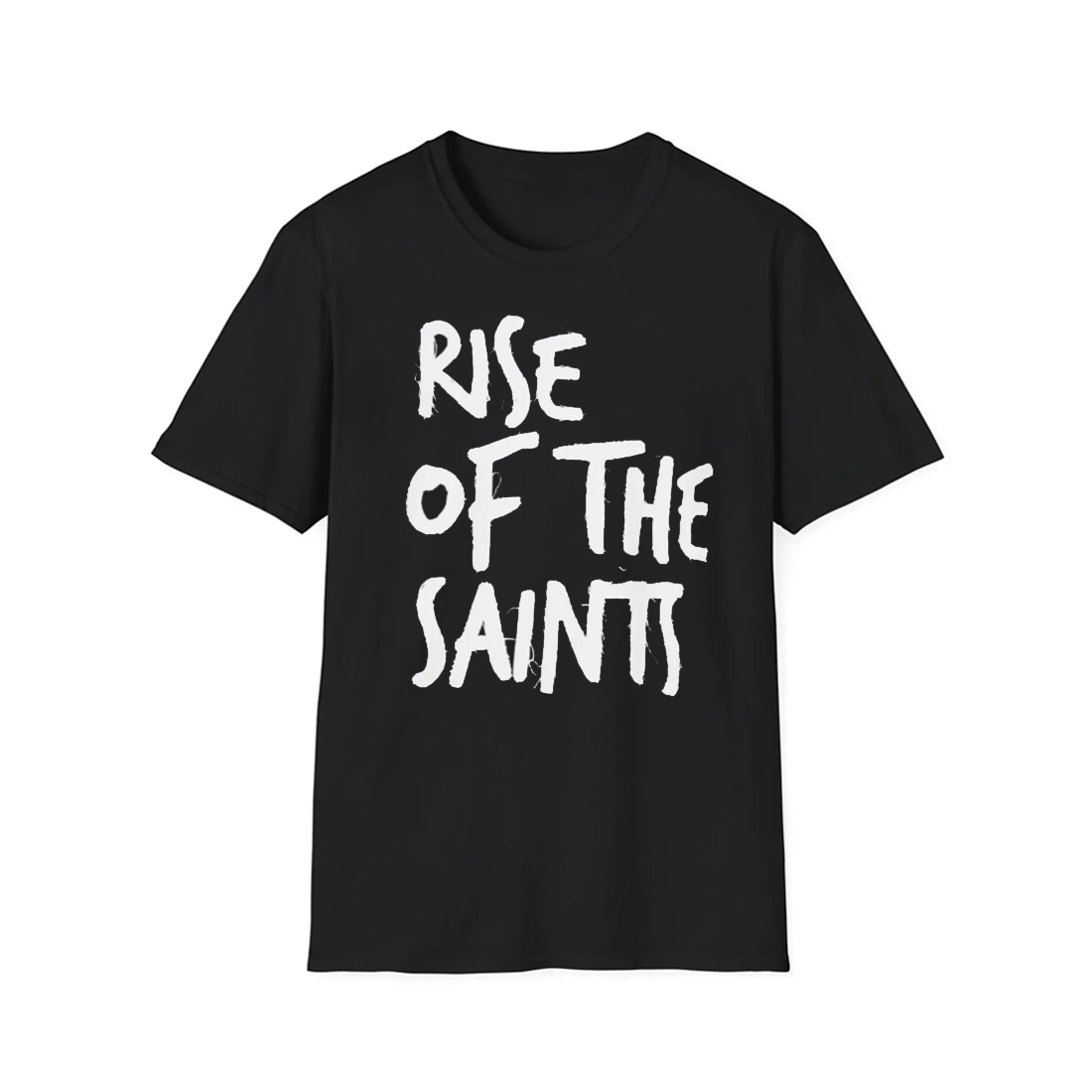 The Chase Young Rise of the Saints Shirt features a striking text-forward design with the words “RISE OF THE SAINTS” stacked vertically in a raw, brush-style font. Printed in white against a deep black background, the lettering feels urgent and intentional, as if painted in motion. There are no distractions here, no extra graphics, no clutter, just a message that commands attention and invites interpretation.