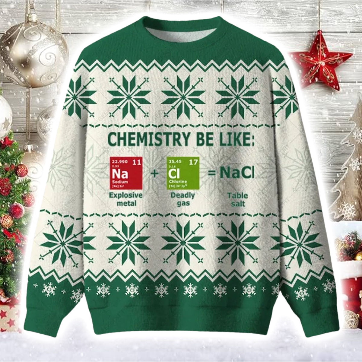 For science lovers who can’t resist a clever joke, the Chemistry Be Like Ugly Christmas Sweater is the ultimate blend of brainpower and holiday cheer. Equal parts nerdy and festive, this design celebrates the magic of chemistry and the humor hidden in every reaction, making it a must-have for students, teachers, and anyone who enjoys a good periodic pun during the holidays.