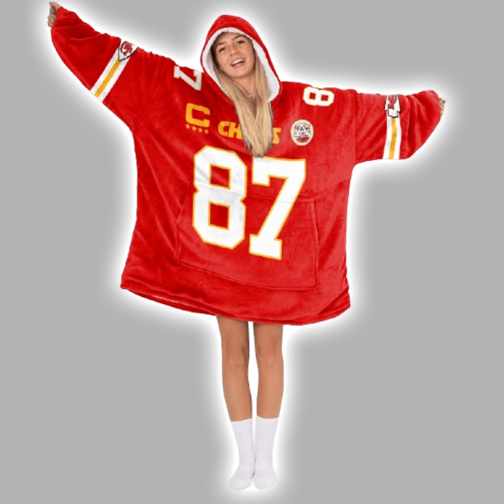 Chiefs 87 Football Unisex Blanket Hoodie This isn’t just a hoodie it’s a cozy, stylish tribute to one of the greatest tight ends in history, Travis Kelce. This ultra plush, oversized hoodie perfectly blends the iconic look of a Chiefs jersey with the unbeatable warmth of a blanket, making it perfect for cold game days, tailgating, or a relaxing night at home.