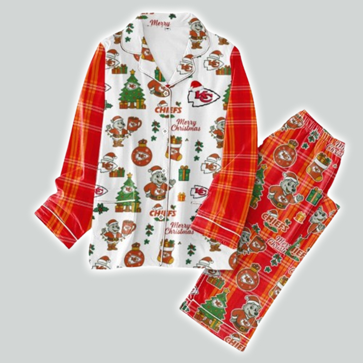 This set features a lively combination of classic holiday symbols and football-themed graphics, creating a fun and cheerful design from top to bottom. The pajama top has a clean white base decorated with Christmas trees, ornaments, wrapped presents, holly leaves, snowflakes, and charming Santa figures dressed in red. Scattered throughout the fabric are repeated “CHIEFS” designs and a bold red arrowhead logo, adding personality and energy to the overall look. The sleeves switch to a bright red plaid pattern that enhances the Christmas feel while giving the outfit a cozy, traditional touch.