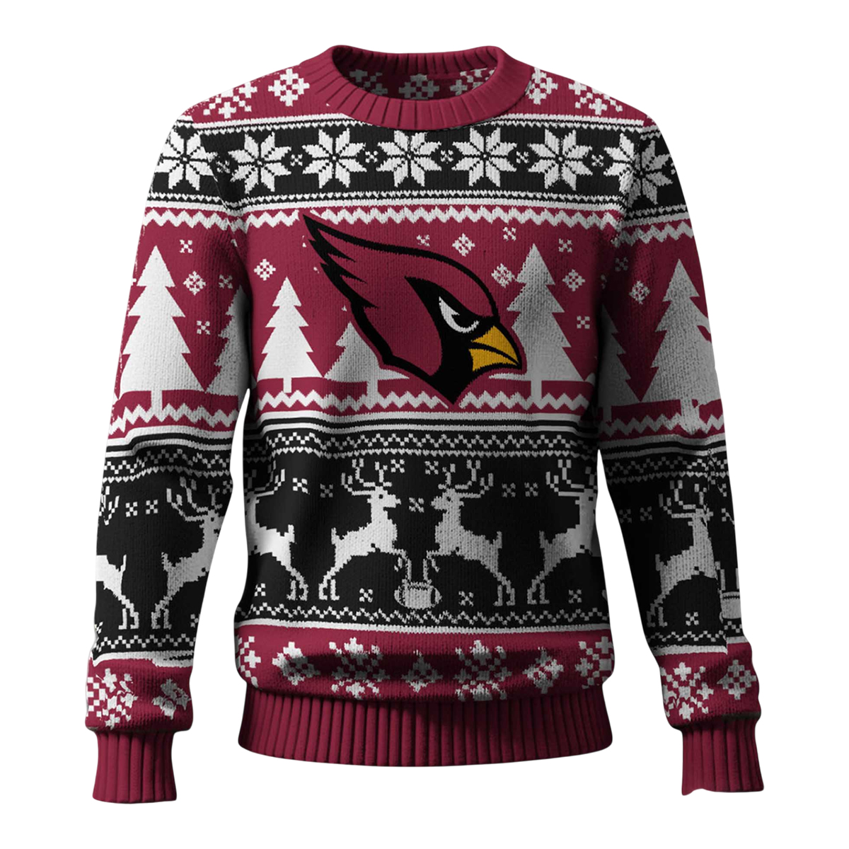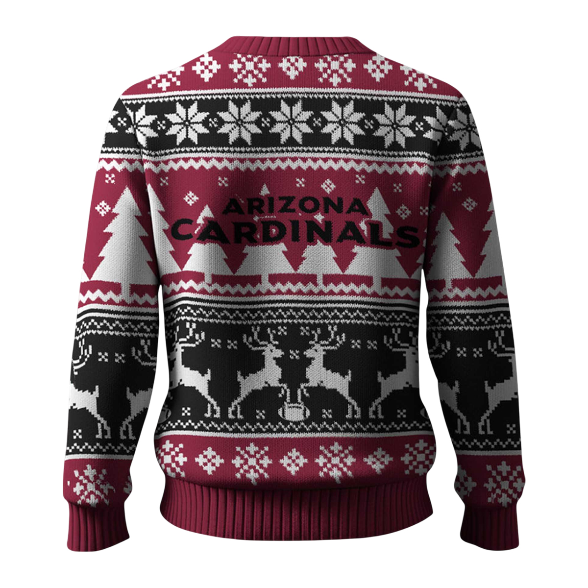 The Christmas Cardinals Reindeer Football Ugly Sweater pairs deep red, black, white, and gold accents in a bold, eye-catching design that perfectly balances cheer and attitude. At the center sits the unmistakable cardinal emblem, surrounded by winter icons like snowflakes, pine trees, and reindeer kicking a football. Every stitch reflects the craftsmanship and attention to detail of a true fan favorite. The contrast between festive patterns and the fierce bird logo gives this sweater its signature look—equal parts cozy and commanding.