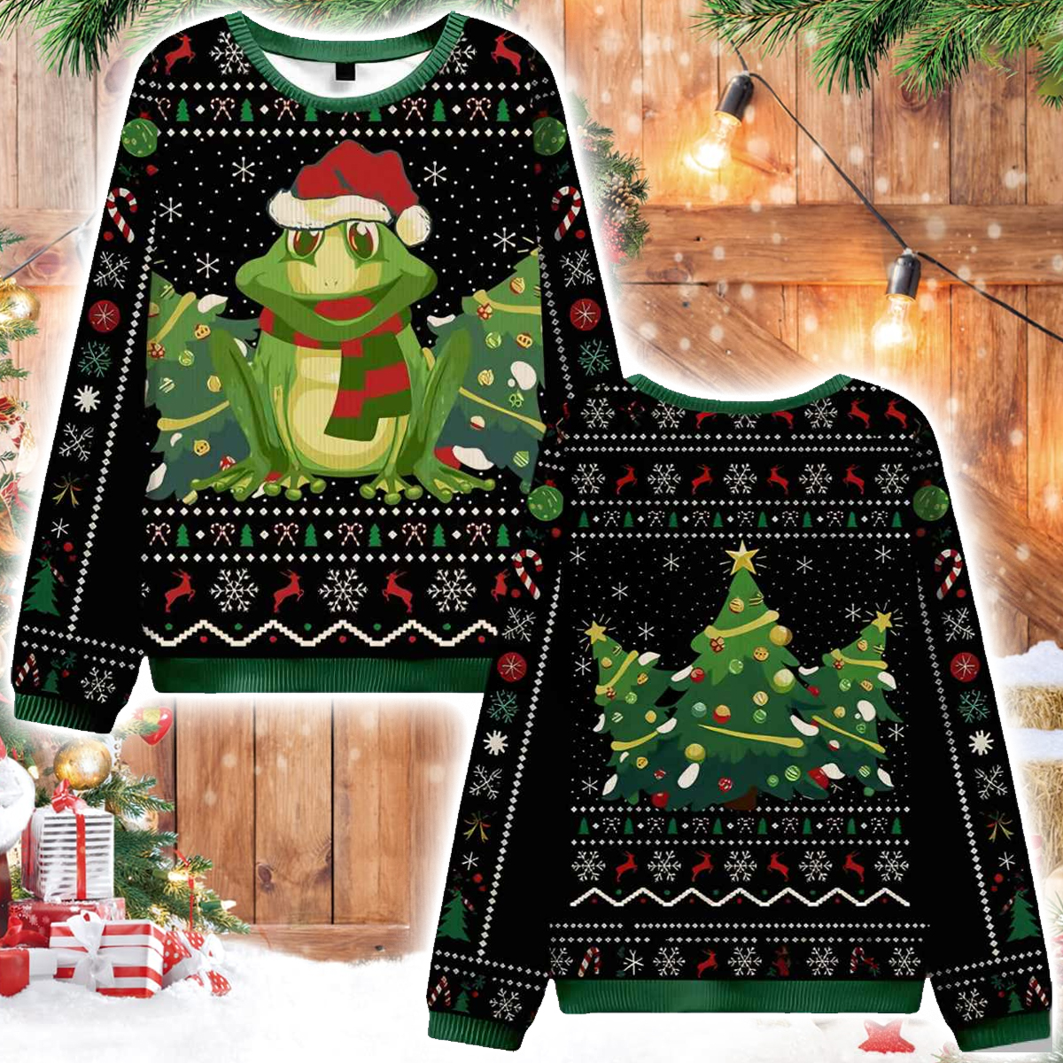 The star of this garment is the irresistibly jolly Christmas Frog itself. Front and center, a large, bright green frog smiles, clearly ready to celebrate. He is fully decked out for the occasion, sporting a classic red Santa hat and a cozy red-and-green striped scarf. To complete the merry scene, he is nestled among a trio of beautifully decorated Christmas trees, looking like he’s patiently waiting for Santa’s arrival.