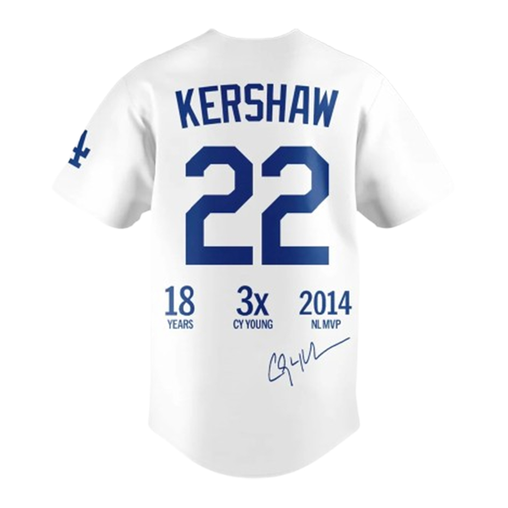 This is a commemorative jersey with a unique design that sets it apart. The front features the classic Dodgers script and Kershaw’s number 22. The back tells his story with key milestones 18 YEARS, 3X CY YOUNG, and 2014 NL MVP, plus a printed signature.