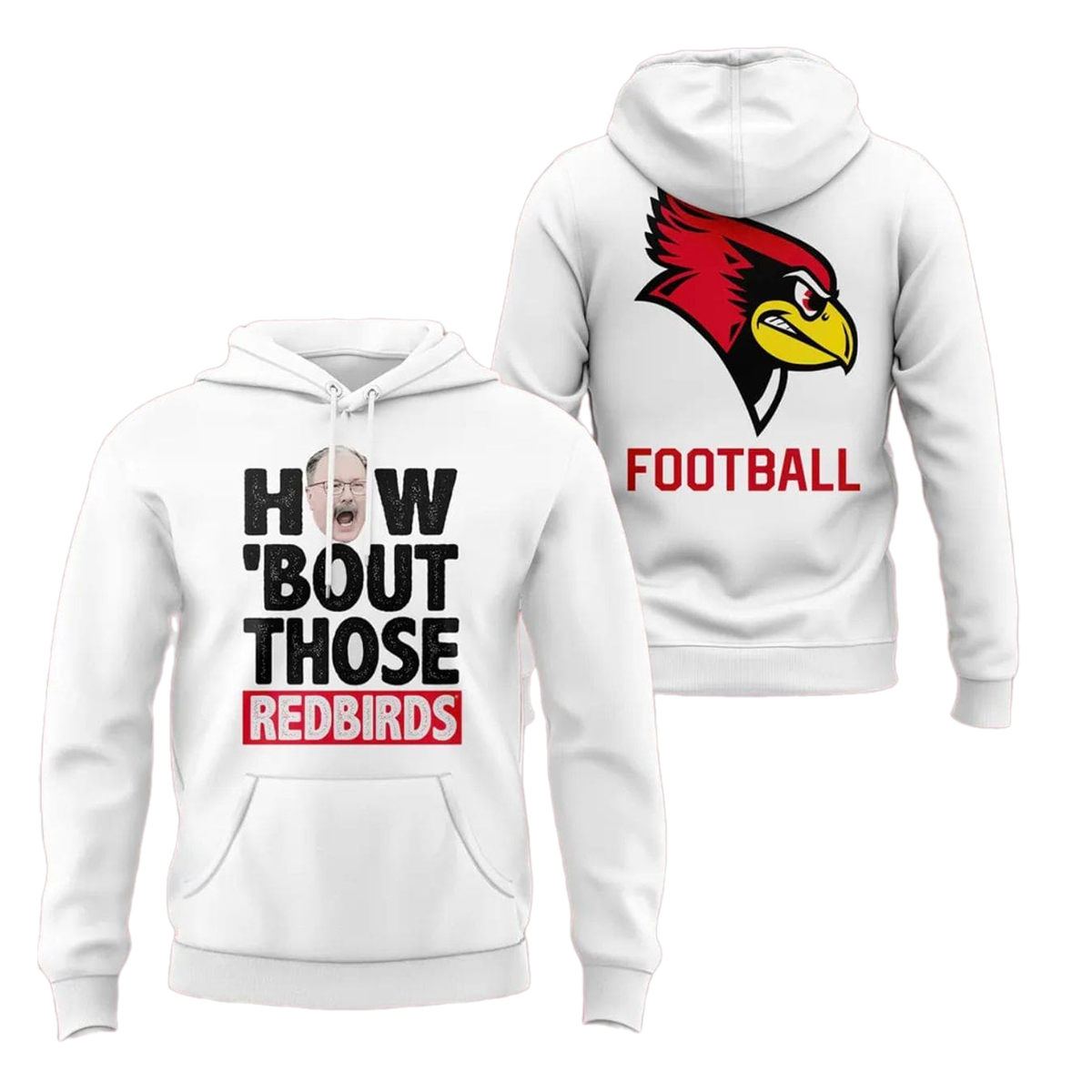 This hoodie features a clean white base that makes every printed detail stand out sharply. On the front, the bold statement “HOW ‘BOUT THOSE REDBIRDS” is printed in large block letters, with “REDBIRDS” highlighted in bright red for extra emphasis. At the top of the design is a fun, expressive image of Coach Spack mid-shout, capturing the exact energy fans remember from key game-day moments. The design feels authentic to Illinois State culture and resonates with anyone who has cheered during those unforgettable plays and sideline celebrations.