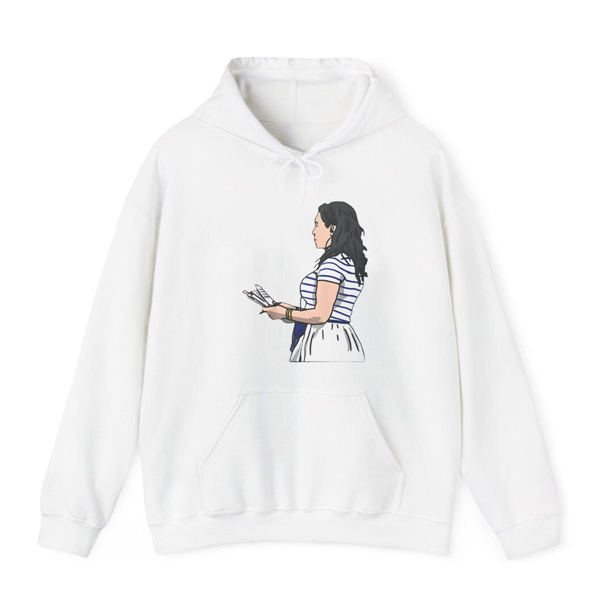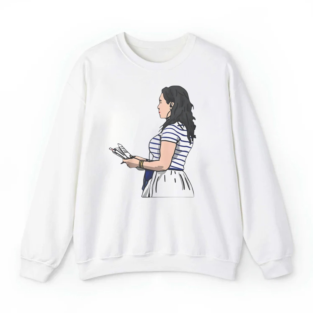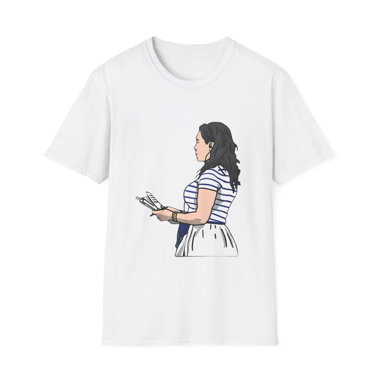 This Colts Carlie Irsay Gordon Shirt features a bold graphic of Carlie Irsay Gordon in profile, dressed in a nautical striped top and skirt, clutching what appears to be laminated play sheets or possibly the entire fate of the game. Rendered in a clean, cartoon-style design, she exudes boss energy from the owner’s suite, captured mid-moment during one of football’s most unintentionally iconic sideline stares.