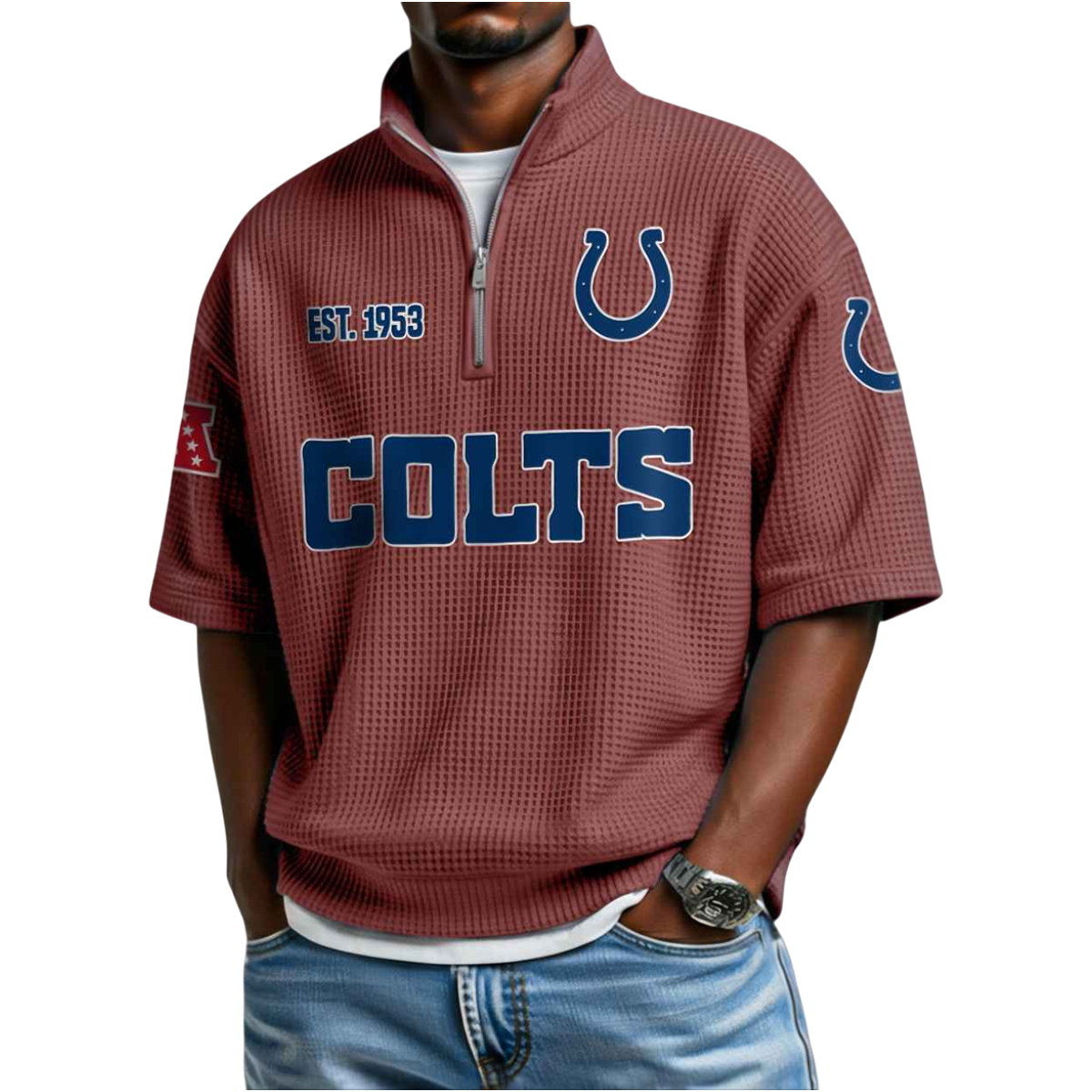 The Colts EST 1953 Quarter Zip Shirt features a distinctive textured fabric in a deep reddish-brown tone that immediately sets it apart. The surface pattern gives the shirt depth and an athletic feel while remaining comfortable enough for everyday wear. Across the chest, the strong “Colts” wordmark stands out clearly, delivering a bold visual statement without overpowering the design. Just above it, the EST. 1953 marking highlights the year the franchise was established, a pivotal moment that marked the beginning of a long and influential football journey.