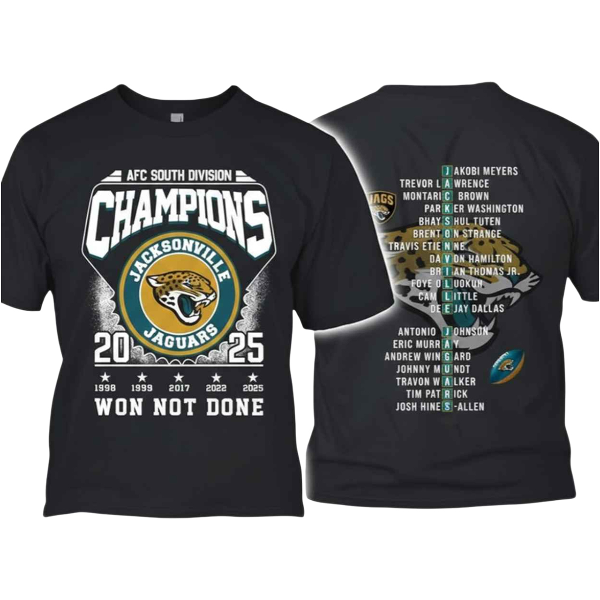The front of the shirt features a strong championship layout with “AFC South Division Champions” displayed prominently above the Jaguars emblem, anchoring the design with authority. The year “2025” stands tall, marking the season when Jacksonville took control of the division once again. Below, the phrase “Won Not Done” delivers a confident message, this title is not an ending, but a step in something bigger.