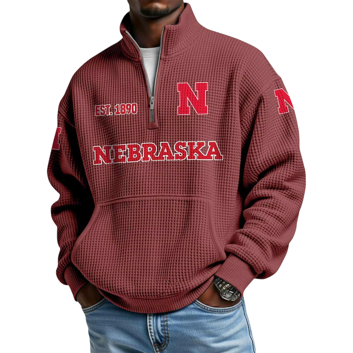 The Cornhuskers Est 1890 Waffle Stand Collar Half Zip Sweatshirt features a deep, rich red tone paired with a textured waffle-knit surface that immediately sets it apart from standard pullovers. The raised waffle pattern adds dimension and visual depth, giving the sweatshirt a structured, premium appearance.