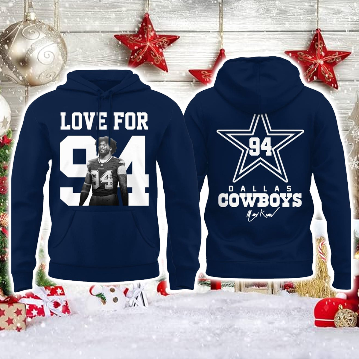 The front of the hoodie features bold white lettering that reads “LOVE FOR 94,” paired with a large printed image of the player in uniform. The dramatic contrast of the navy fabric with the bright graphic gives the design a powerful presence. On the back, a large star outline frames the number 94 in the center, with “DALLAS COWBOYS” printed below in strong block letters. The addition of a signature-style graphic adds a meaningful finishing touch that fans appreciate. This hoodie gained traction during recent fan events and winter watch parties, especially when supporters wanted to show their appreciation for the player’s consistency and breakout performances.