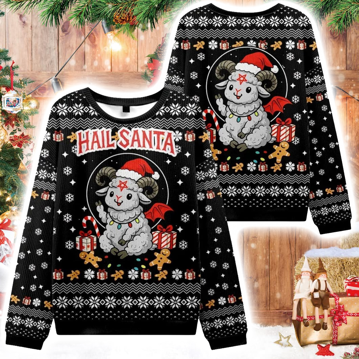 The Devil Sheep Hail Santa Ugly Sweater features a mischievous ram dressed as Santa, complete with a red hat, candy cane, and tiny bat wings. Above it, the bold text “HAIL SANTA” steals the spotlight, a clever, tongue-in-cheek play on classic holiday slogans. Surrounding the main design are snowflakes, wrapped presents, gingerbread men, and Christmas candies, all knitted into a traditional fair-isle pattern on a deep black background.