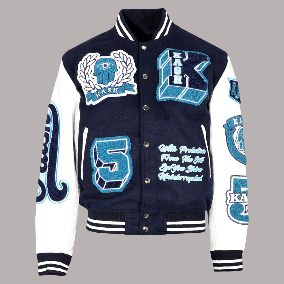 This jacket features a rich navy body paired with crisp white sleeves for a clean varsity silhouette. Oversized chenille patches dominate the front and sleeves, including a large “KASH” block letter, a textured number 5, and crest-style insignias that give the jacket authentic letterman energy. Script text is embroidered across the front, adding a unique artistic touch that makes the piece feel handcrafted rather than mass-produced. This style surged in popularity following the rise of the “Kash” aesthetic throughout 2024–2025, where athletes and creators embraced bold chenille pieces to express individuality both on and off the field.