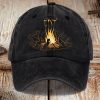 The design of the Distressed Washed Cotton Cat FDT Hat is inspired by camping culture and cat memes, with the image of a cat gathering around a fire and the letters FDT humorously combining warmth and wild style.