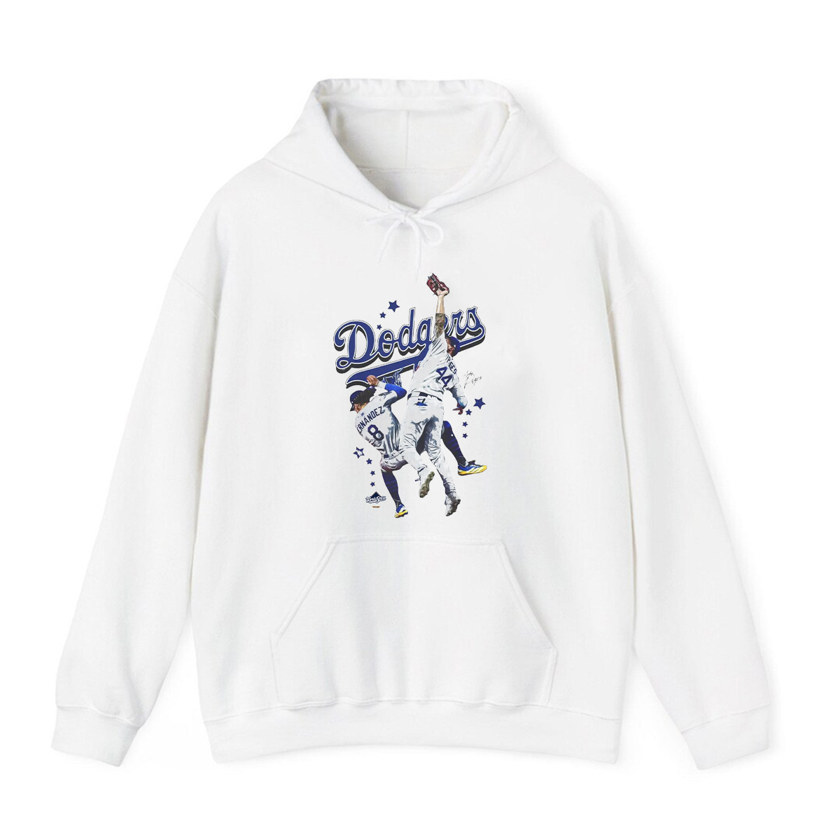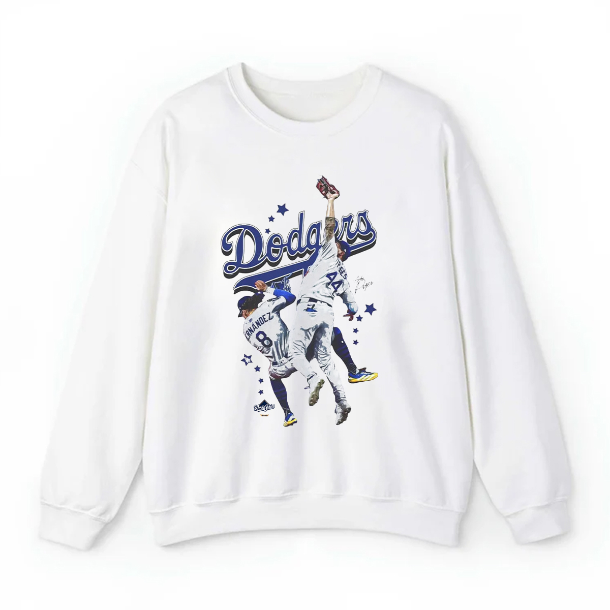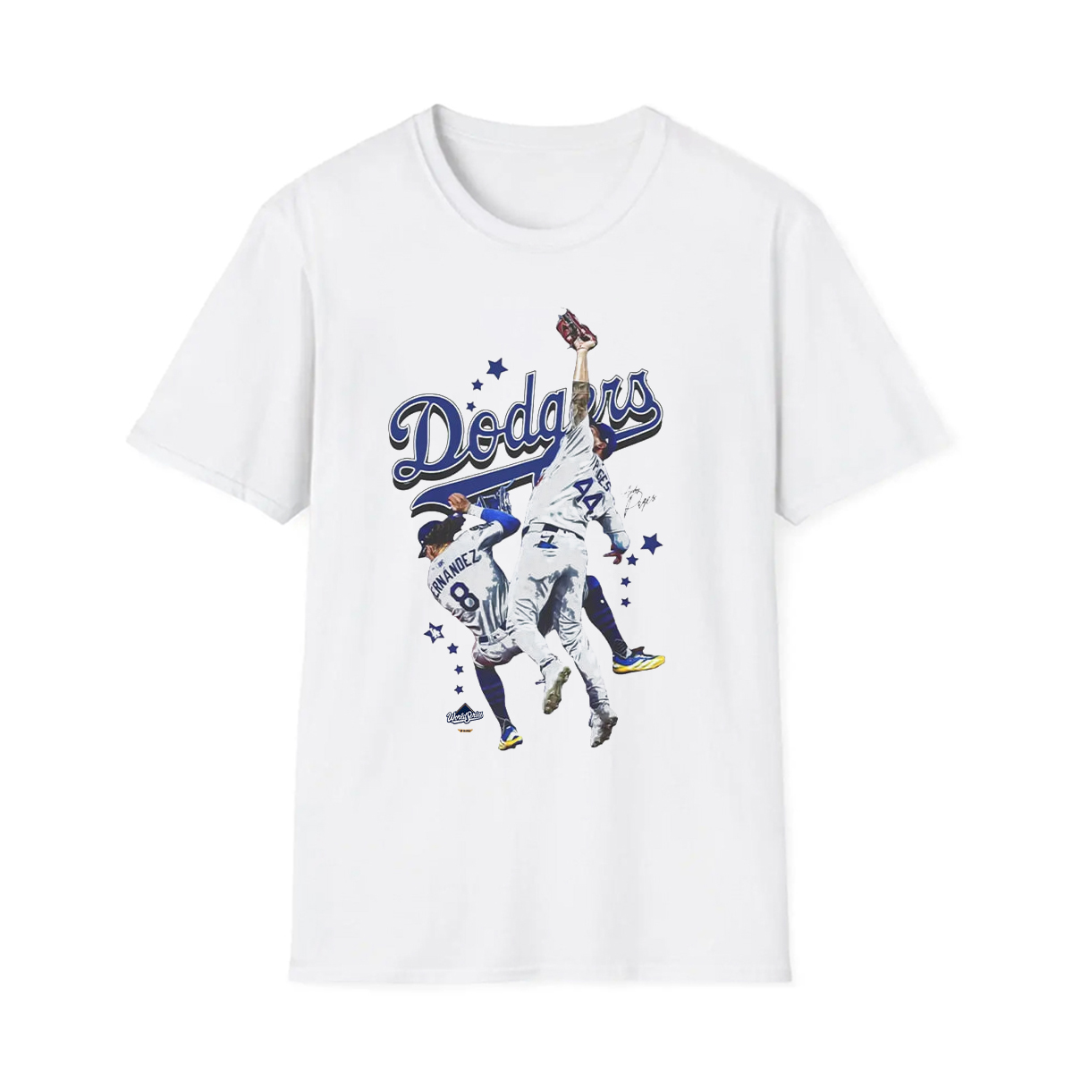 The Dodgers Andy Pages Catch Shirt is a dynamic piece of apparel that freezes an electrifying, gravity-defying moment of defensive mastery on the field. This clean, white shirt serves as the canvas for a vivid, action-packed graphic that captures players, including a focus on Andy Pages’ incredible athleticism. The design features a dramatic image of an outfielder soaring into the air, glove extended, making a spectacular, clutch catch that epitomizes dedication and acrobatic skill.
