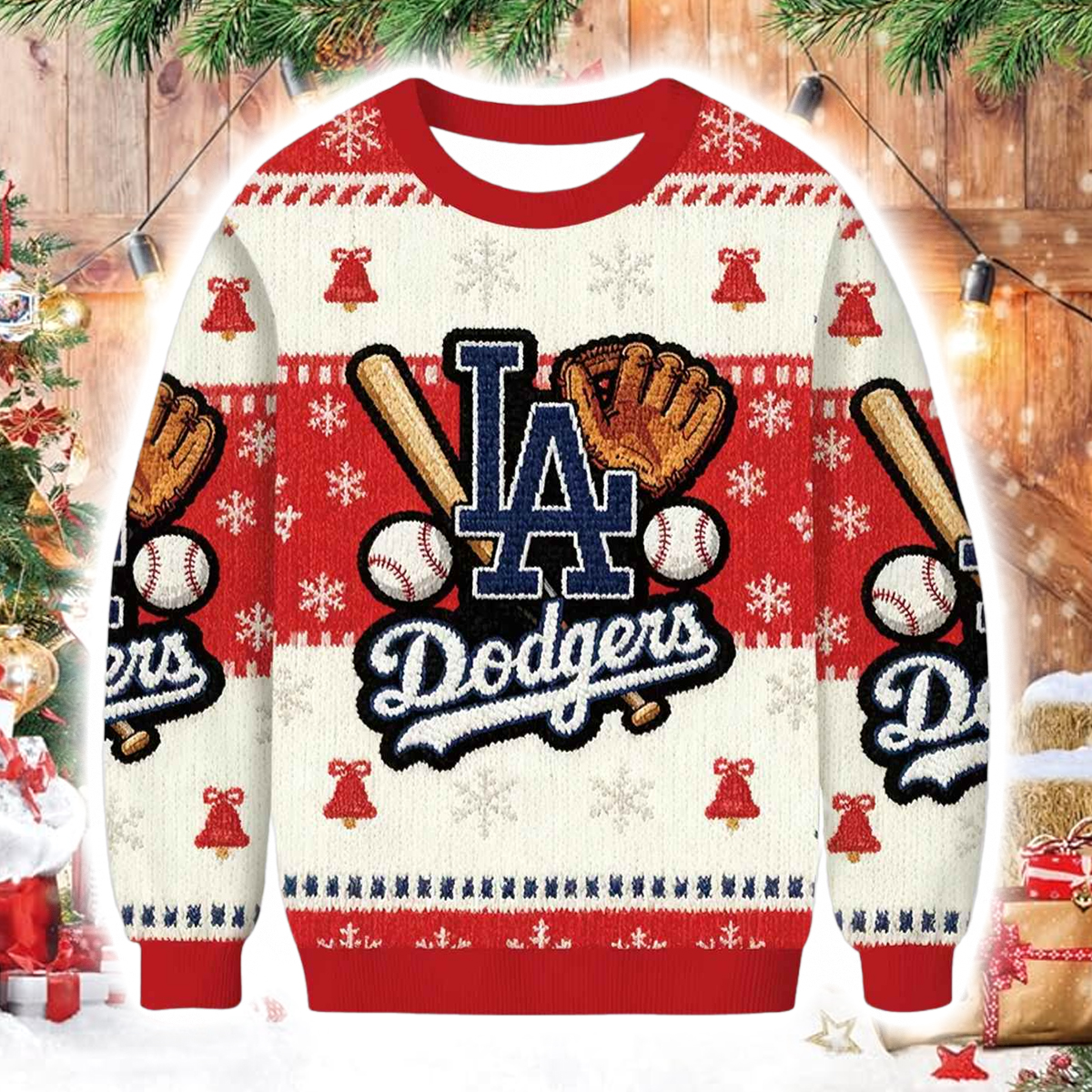The Dodgers LA Red Christmas Ugly Sweater features the classic “LA Dodgers” logo boldly displayed at the center, surrounded by baseball bats, gloves, and snowflakes, a playful nod to the season’s joy and the sport’s timeless excitement. The design’s red-and-white base adds a refreshing holiday twist, with decorative patterns of bells, snowflakes, and festive borders that make it both cheerful and stylish. Every stitch carries the warmth of winter and the thrill of the ballpark, making it a must-have for fans who bleed blue even during Christmas.