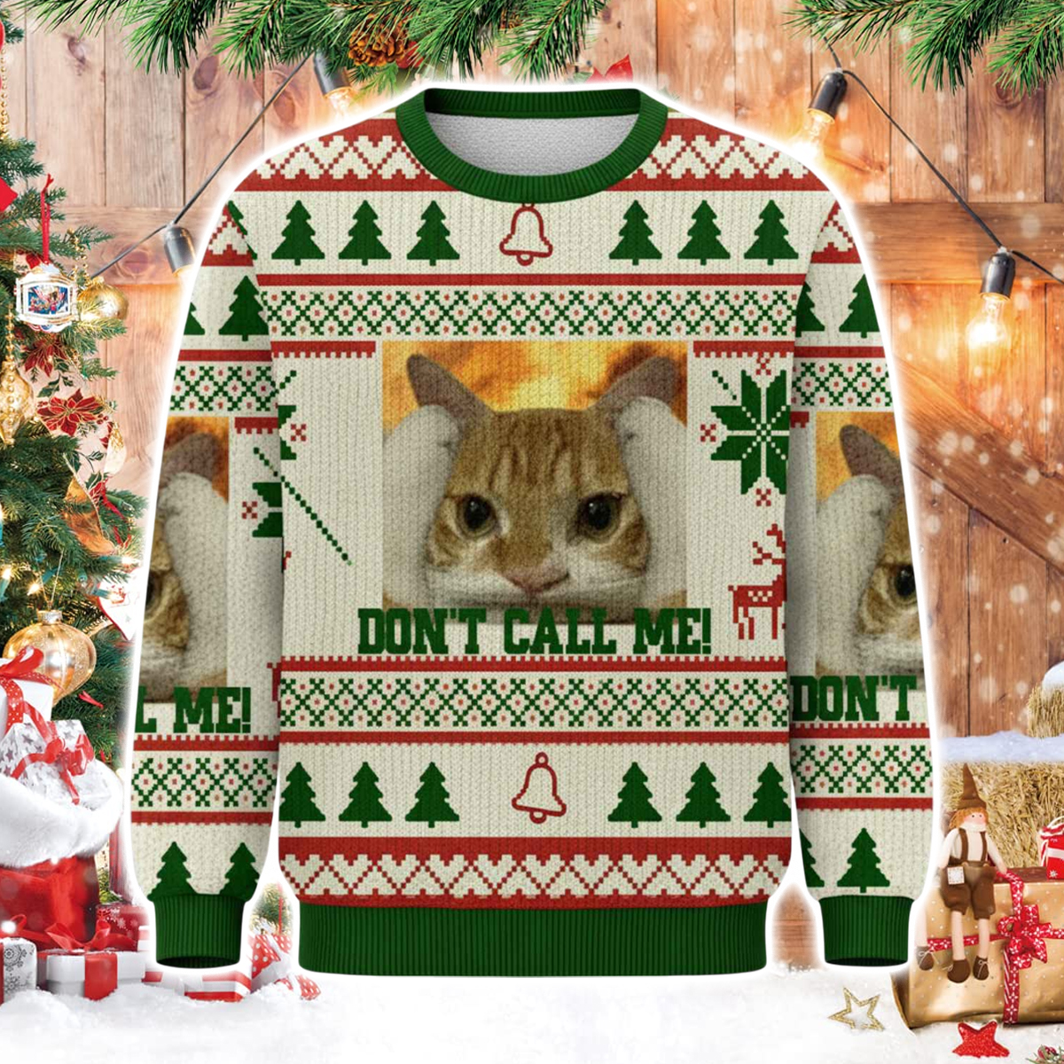 At the center of the design is a wide-eyed orange cat, nestled cozily under a blanket with an unmistakable look of annoyance and exhaustion, the exact face most of us make when our phone rings for the tenth time during December. The bold text “DON’T CALL ME!” sits directly below the cat, making the message loud and clear. Surrounding the image is a knitted-style pattern featuring evergreen trees, bells, snowflakes, pixel reindeer, and geometric Nordic accents. The color palette blends warm cream tones with red and green highlights, giving the sweater a classic Christmas feel while still keeping the focus on the cat’s iconic expression. This design gained traction across social platforms in recent holiday seasons as cat memes and “holiday burnout humor” skyrocketed in popularity, making it a fan-favorite at parties and gift exchanges.