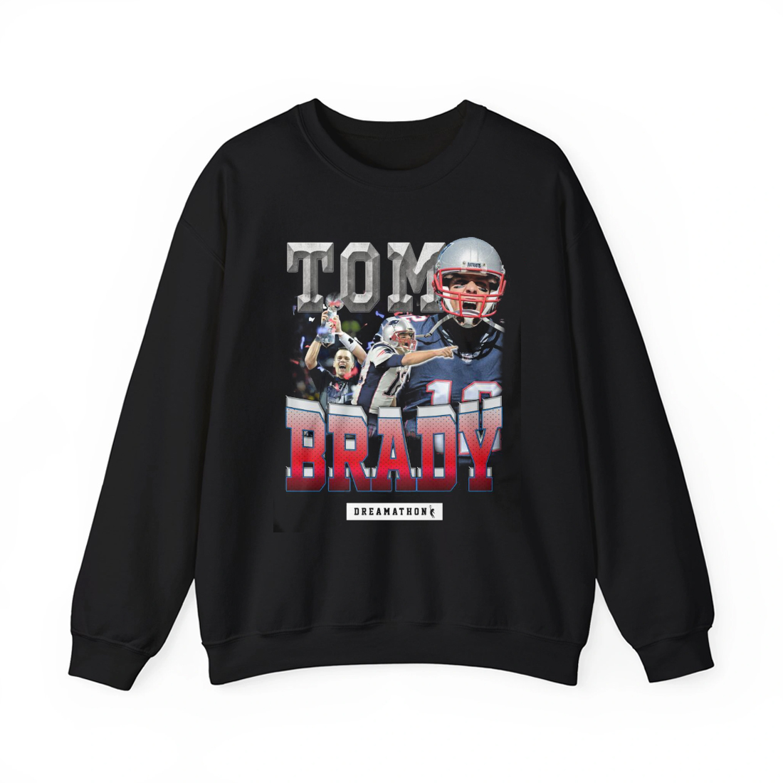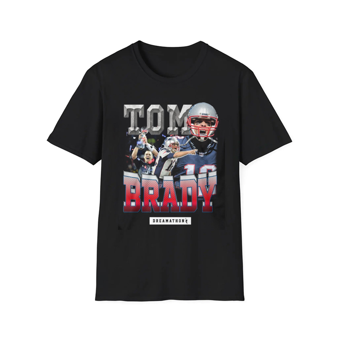 This black short-sleeve t-shirt features a powerful graphic collage of Tom Brady in action capturing multiple iconic moments from his legendary career. The bold text “TOM BRADY” is prominently displayed in metallic and red gradient lettering, adding a dynamic, high-energy feel to the design. Below the name is the “DREAMATHON” tag, tying the visual theme to the dreamer mentality that defines Brady’s legacy. The layout is striking, making this shirt a centerpiece for any fan who
