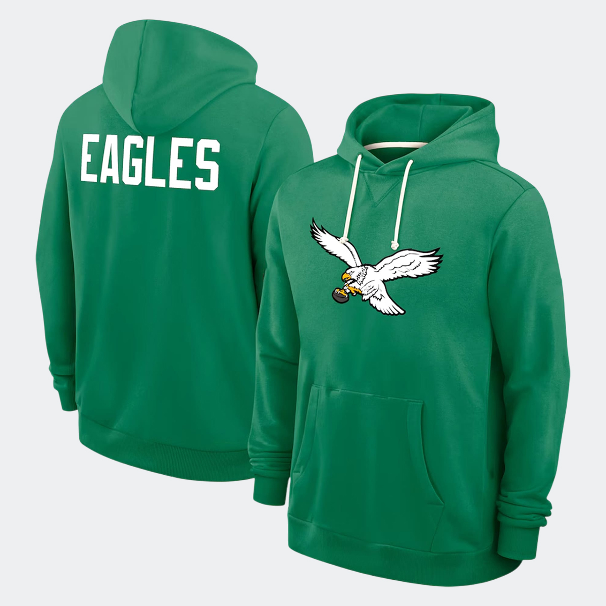 The Eagles Kelly Green Hoodie 2025 captures everything fans love about the team’s heritage look. Made in the iconic kelly green that once ruled the field, it features the vintage flying eagle logo across the chest, wings stretched wide, clutching a football mid-flight. On the back, bold white lettering spells out “EAGLES,” leaving no question where your loyalty lies. The white drawstrings add a clean contrast to the vivid green, while the soft interior fleece ensures comfort that lasts through every quarter, tailgate, or chilly evening.