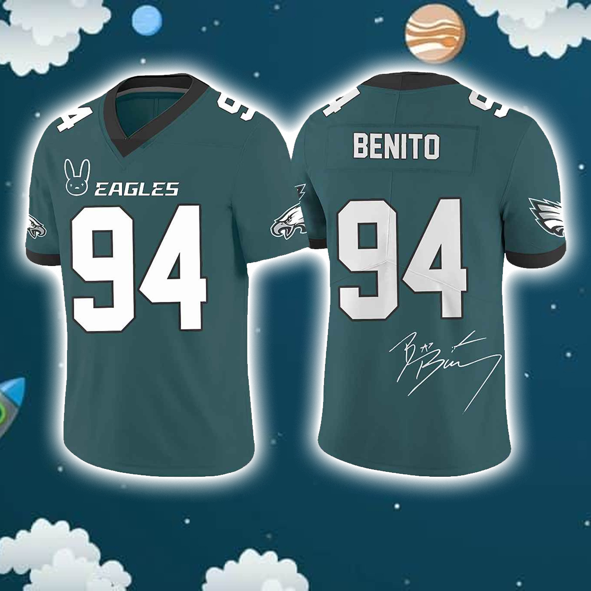 The Eagles x Bad Bunny Jersey is the perfect blend of team pride and iconic style. Featuring the number 94 and the name Benito, this jersey brings together the Eagles’ spirit and Bad Bunny’s creative touch in a bold, fashionable design.