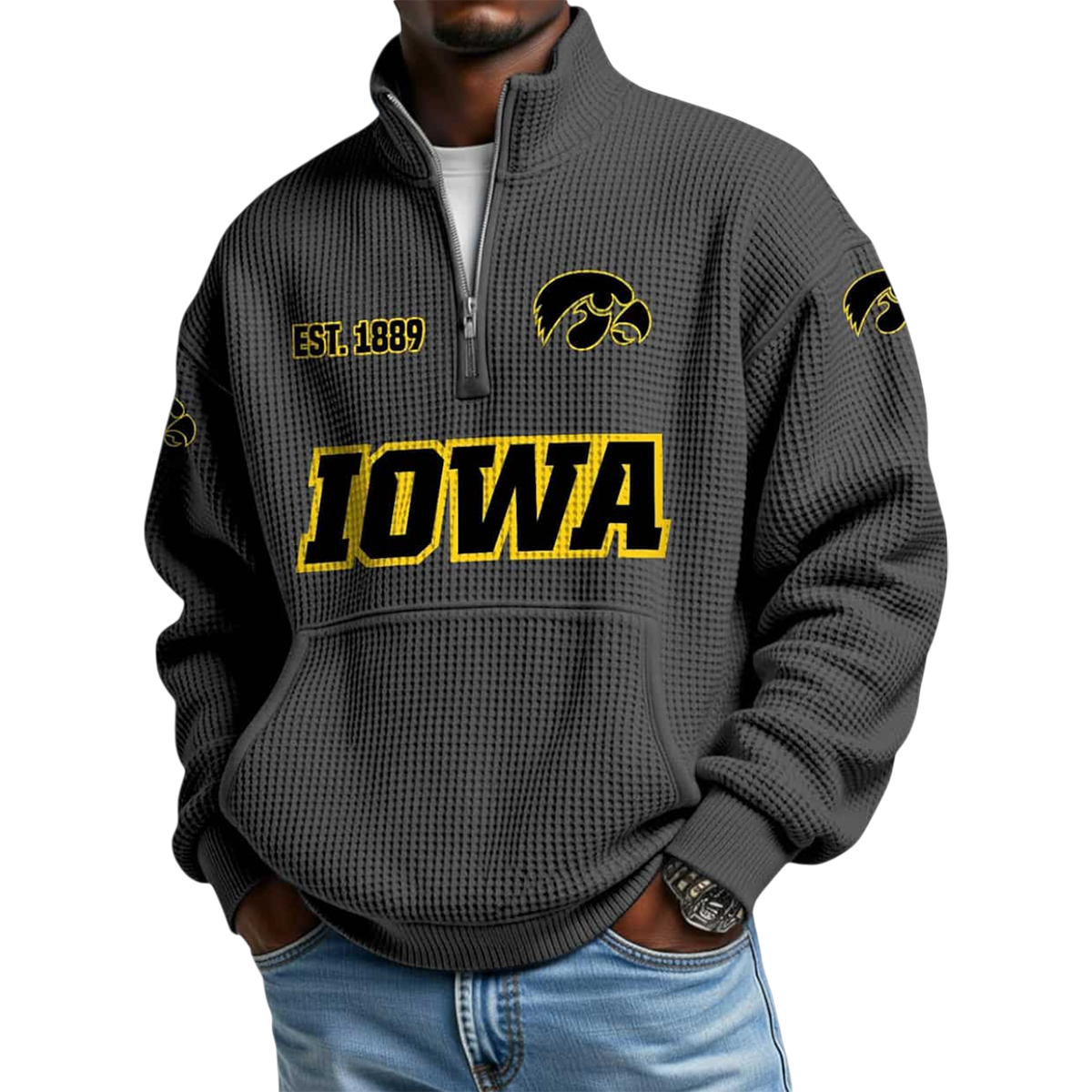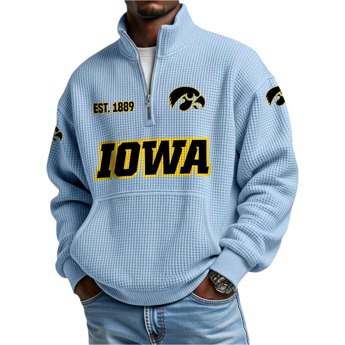 The Est 1889 Hawkeyes Waffle Stand Collar Half Zip Sweatshirt is crafted for those who value history, identity, and everyday versatility. Marked by a founding year that traces back to 1889, this sweatshirt represents generations of pride and perseverance while fitting seamlessly into modern wardrobes.