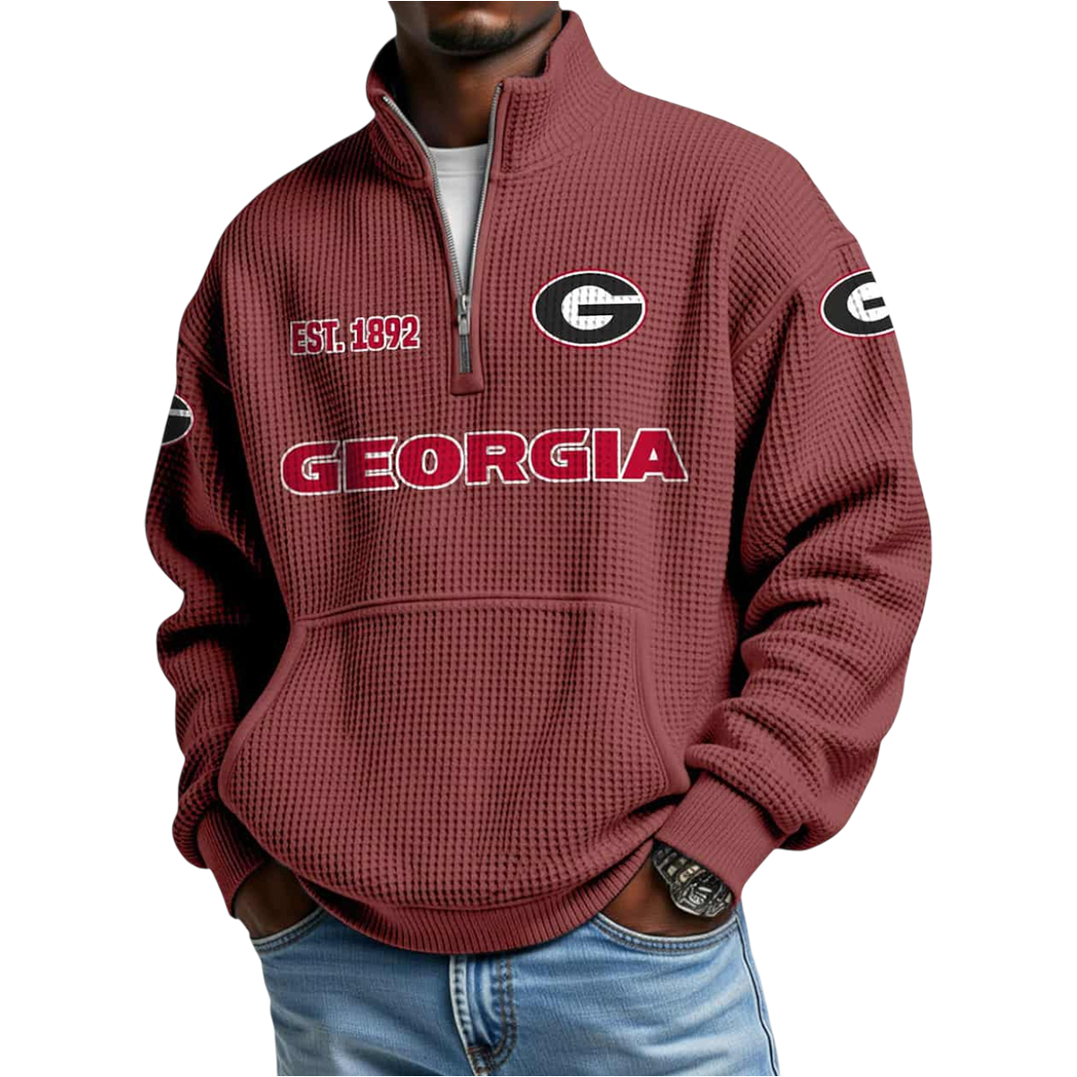 This sweatshirt features a charcoal waffle-knit fabric that immediately stands out for its depth and structure. The waffle texture adds visual interest while providing breathable warmth, making it suitable for changing seasons. Across the chest, “GEORGIA” appears in bold lettering, framed cleanly against the textured background. Just above it, “EST. 1892” marks the origin year, grounding the design in a story that spans generations.