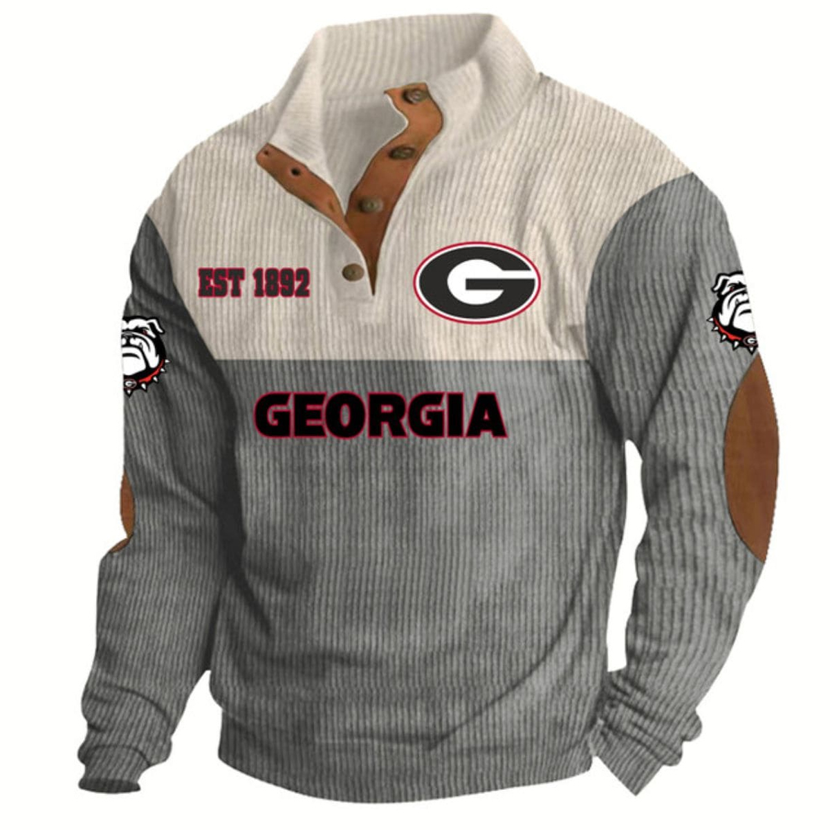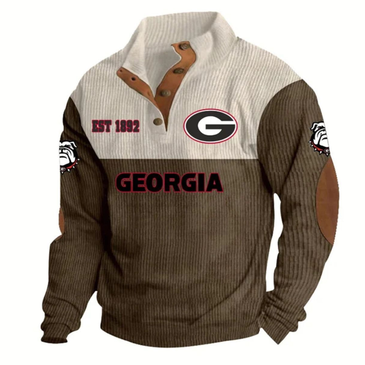 This sweatshirt features a distinctive two-tone corduroy-style texture with a cream upper section and a rich brown lower section. The stand-up collar, secured with rustic button details, adds a vintage outdoors feel that sets it apart from standard sweatshirts. Across the chest, the bold GEORGIA lettering creates a powerful focal point, while the upper left front displays EST 1892, honoring the deep roots of the program and its long history of passionate supporters. The classic “G” emblem sits prominently on the right chest, providing strong team identity at a glance. On each sleeve, detailed bulldog graphics add extra personality, complemented by brown elbow patches that give the design a rugged, heritage-inspired finishing touch.