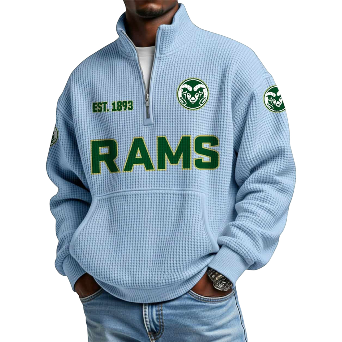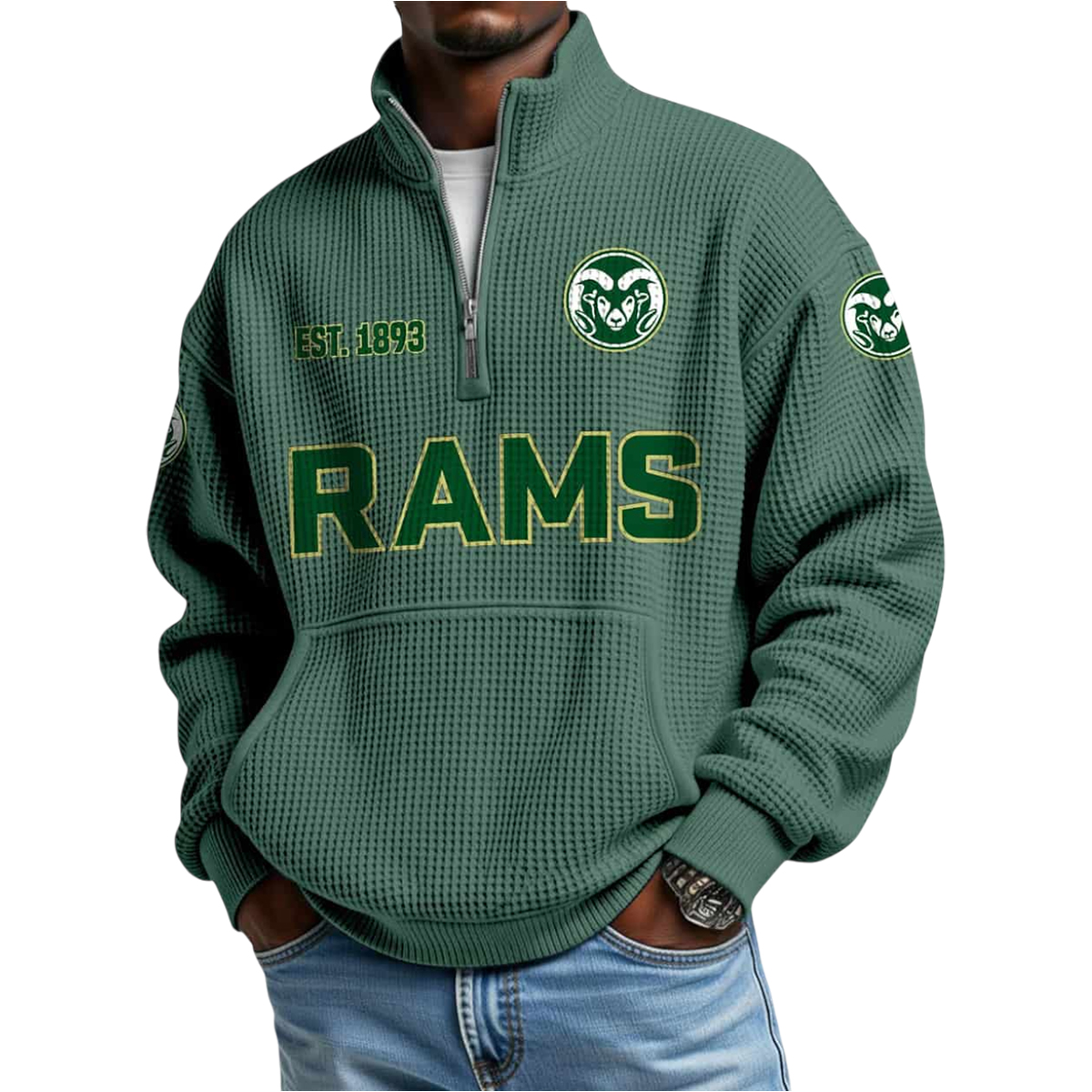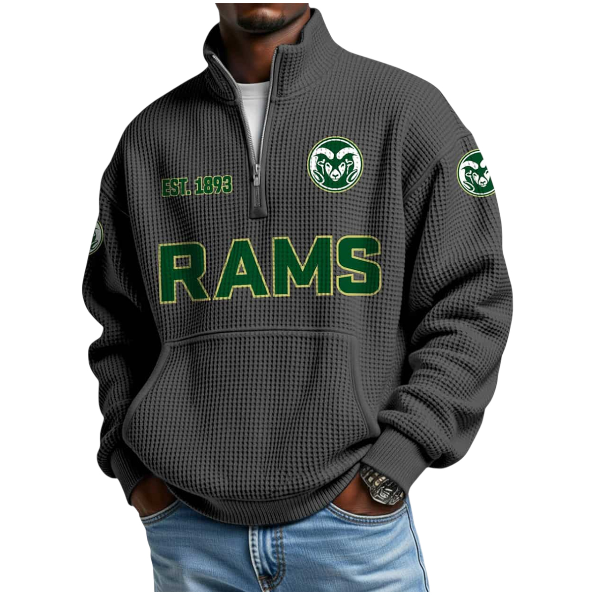 A distinctive ram emblem appears on the chest and sleeve, adding balance and identity without overwhelming the layout. The stand collar with a smooth half-zip closure offers flexible styling, zip up for added warmth or leave it slightly open for a relaxed feel. This design draws inspiration from milestone celebrations and heritage-focused moments that reflect the enduring presence of Colorado State tradition, reimagined in a contemporary waffle-knit form.