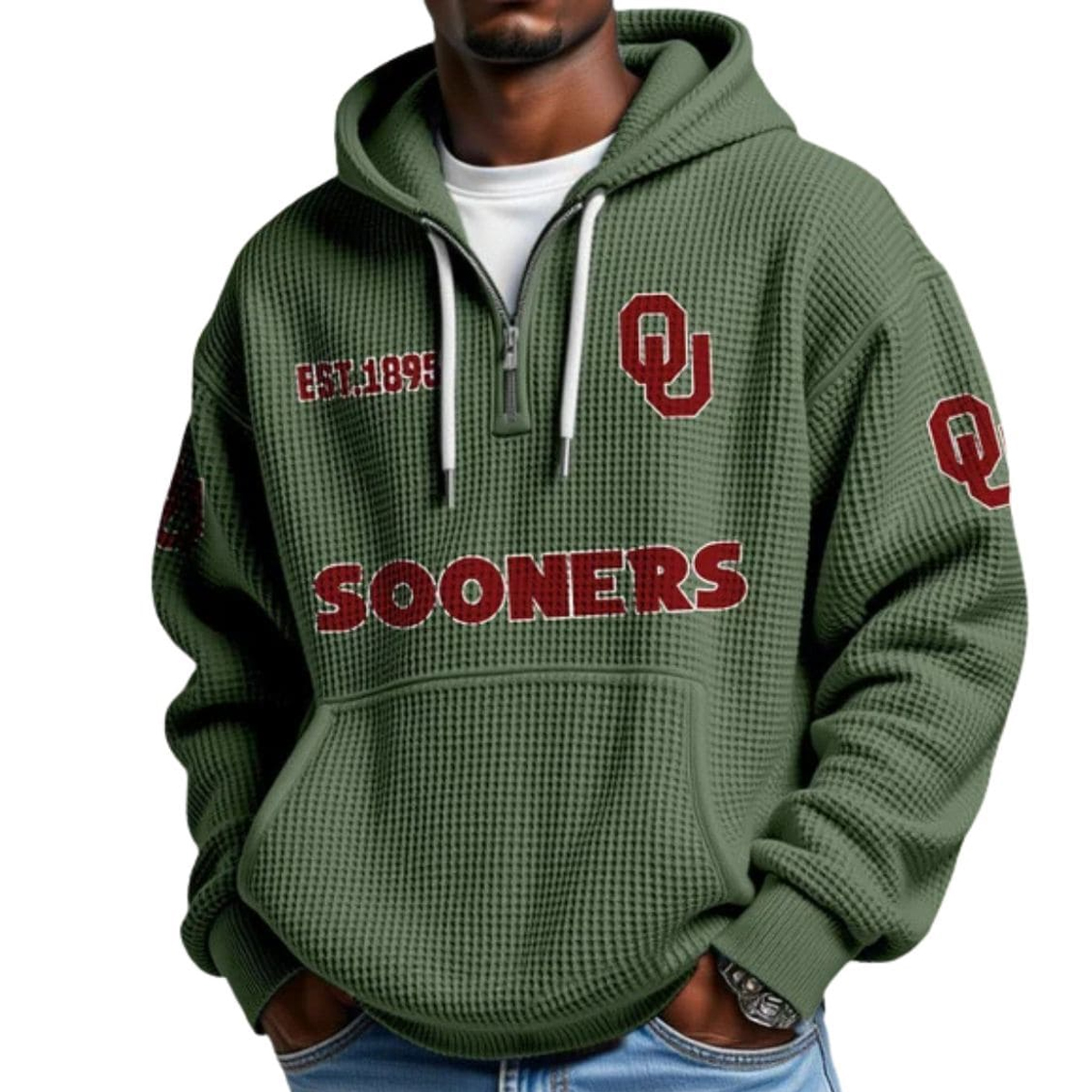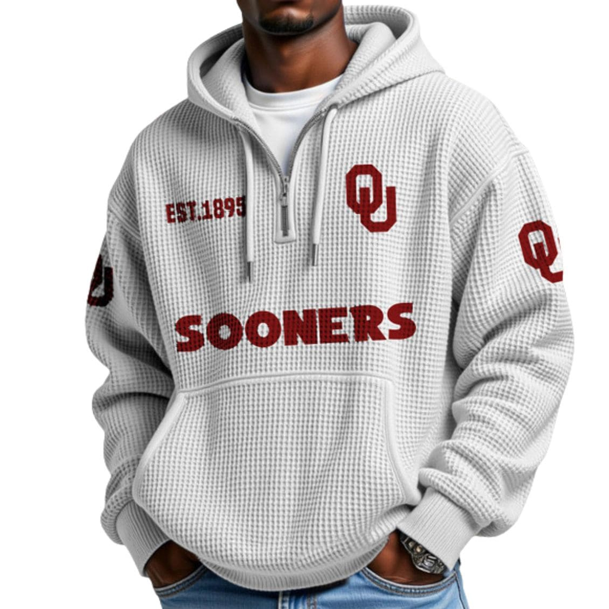 In conclusion, the EST 1895 Sooners College Football Half Zip Waffle Hoodie is a standout choice for anyone who wants to celebrate team pride with comfort, style, and authenticity. Whether you’re commemorating a memorable season or simply looking for a warm, well-designed hoodie to elevate your everyday look, this piece delivers the perfect blend of character and function. Add it to your collection and carry your Sooners pride confidently wherever you go.