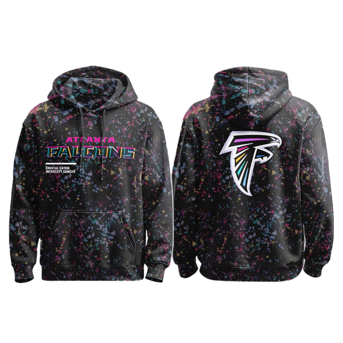 The Falcons Crucial Catch 2025 Hoodie is more than just a stylish addition to your collection it’s a symbol of awareness, strength, and community. Featuring a dynamic all-over paint-splatter pattern on a dark background, this hoodie bursts with personality. The front showcases the vibrant Atlanta Falcons text in striking neon tones, standing out with energy and pride. Just beneath it sits the Crucial Catch Intercept Cancer patch, a reminder that this hoodie is designed with more than just fashion in mind.