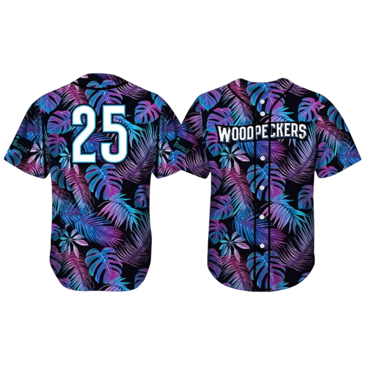 This jersey stands out immediately with its all-over tropical print, featuring layered palm leaves in vibrant shades of purple, teal, blue, and pink set against a dark background. The front showcases “WOODPECKERS” in clean, high-contrast lettering, while the back highlights the number “25,” marking the 2025 season in a bold, eye-catching style. The button-front design keeps the silhouette classic, while the colors push it into playful, modern territory.