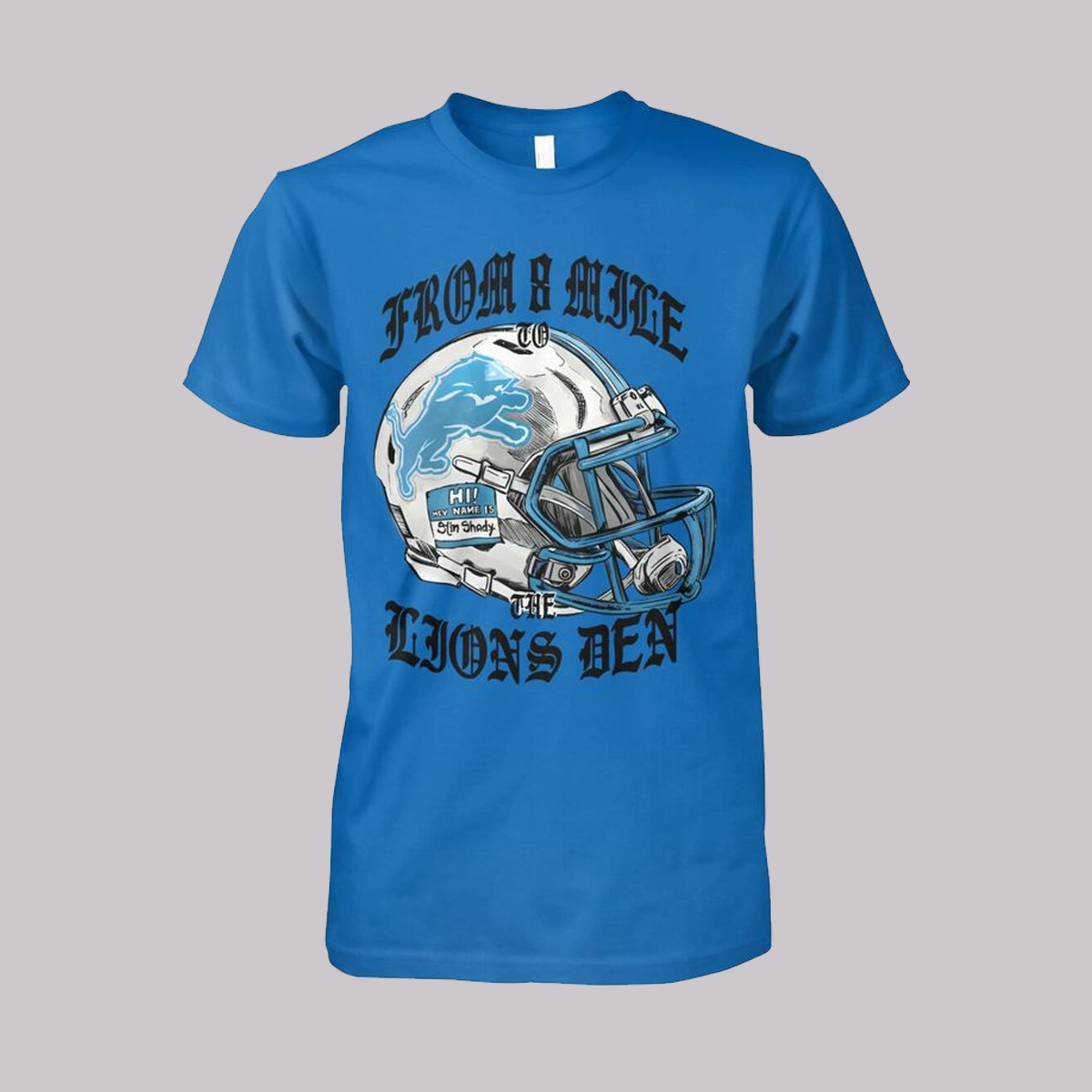 The design on the From 8 Mile To The Lions Den Eminem Shirt is striking and highly detailed. The front features a large Detroit-style football helmet illustrated in icy blues and metallic grays, complete with rugged outlines that give it a hand-drawn, street-art aesthetic. On the helmet’s label, a subtle nod appears: “Hi! My Name Is Slim Shady,” paying tribute to one of the most iconic artists to come out of 8 Mile. Surrounding the central graphic is the phrase “FROM 8 MILE TO THE LIONS DEN” in bold gothic typography, giving the shirt a gritty urban feel that matches Detroit’s cultural identity.