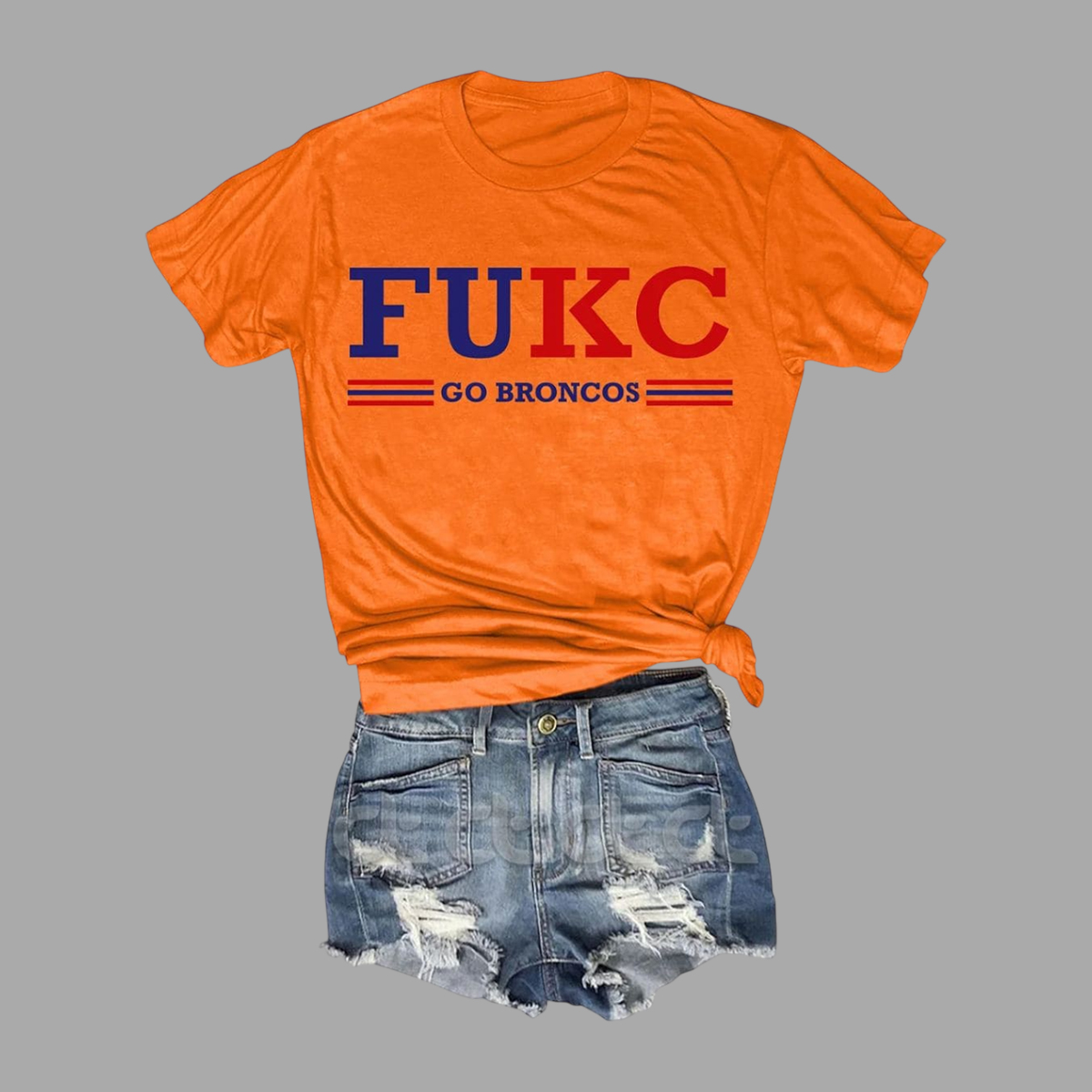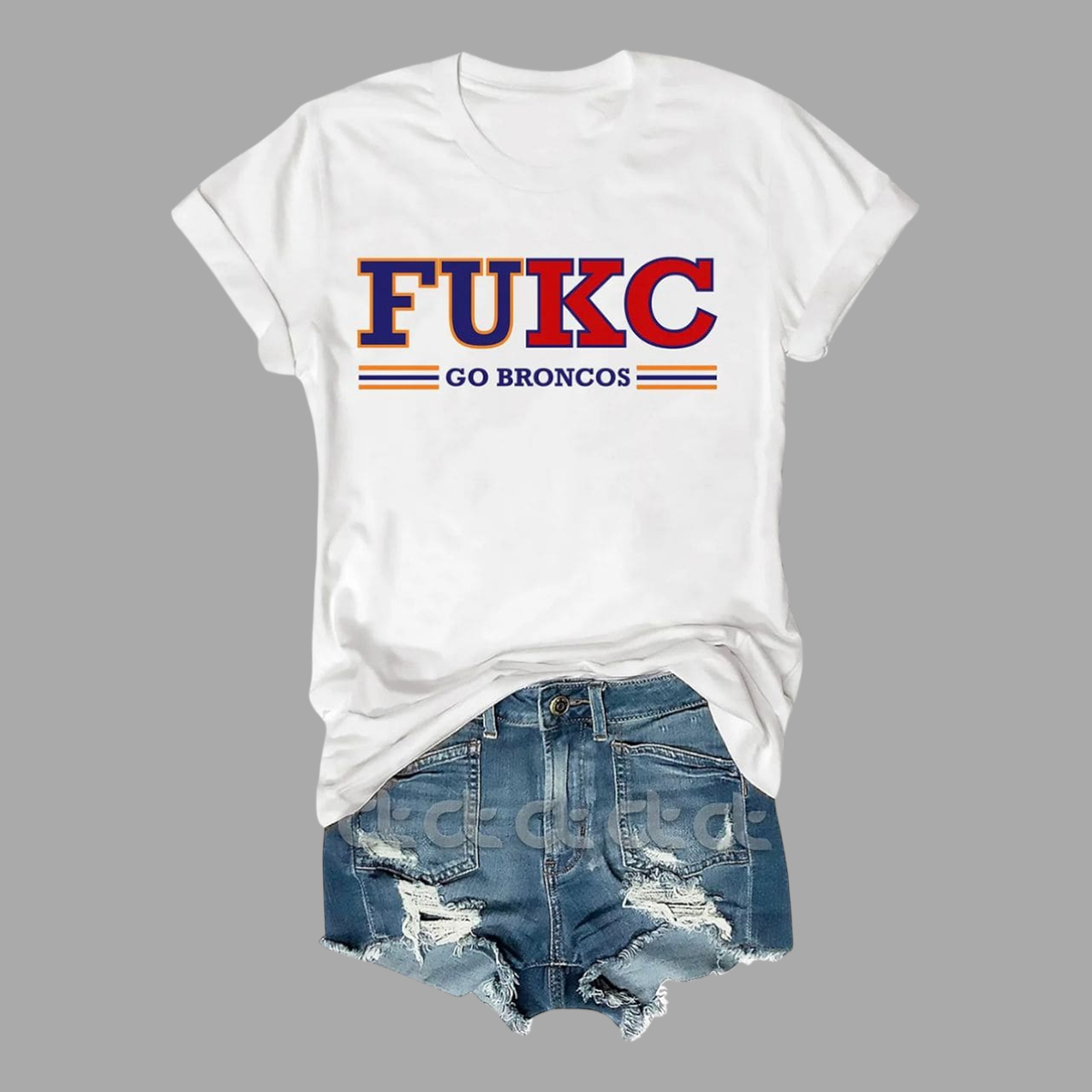 This design became a breakout favorite after a wave of fan-made signs and chants spread across social media during a heated matchup weekend. Supporters wanted a fun, rebellious way to express their competitive spirit, and this phrase quickly became one of the most shared visuals online. The shirt captures that viral moment perfectly. The large, block-style “FUKC” text draws instant attention, while “GO BRONCOS” underneath adds the finishing touch that makes the message both playful and unmistakably passionate.