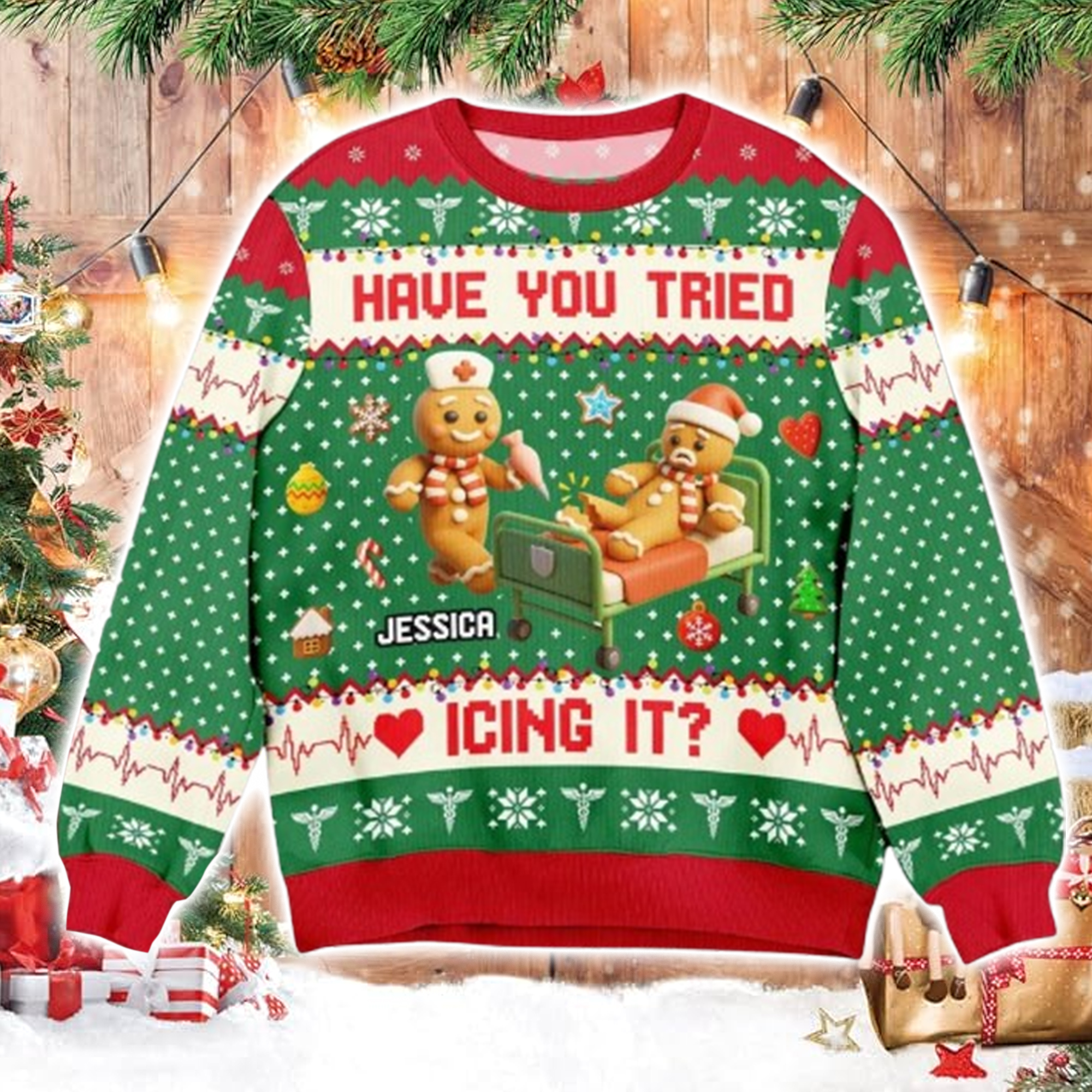 The Funny Nurse Have You Tried Icing It Ugly Christmas Sweater captures the fun side of nursing life with a scene that’s as sweet as it is hilarious. The design features two adorable gingerbread cookies, one lying in a hospital bed with a “frosting injury” and the other offering care with a smile. Above them, bold red letters spell out “HAVE YOU TRIED ICING IT?”, the phrase every nurse (and patient) knows too well.