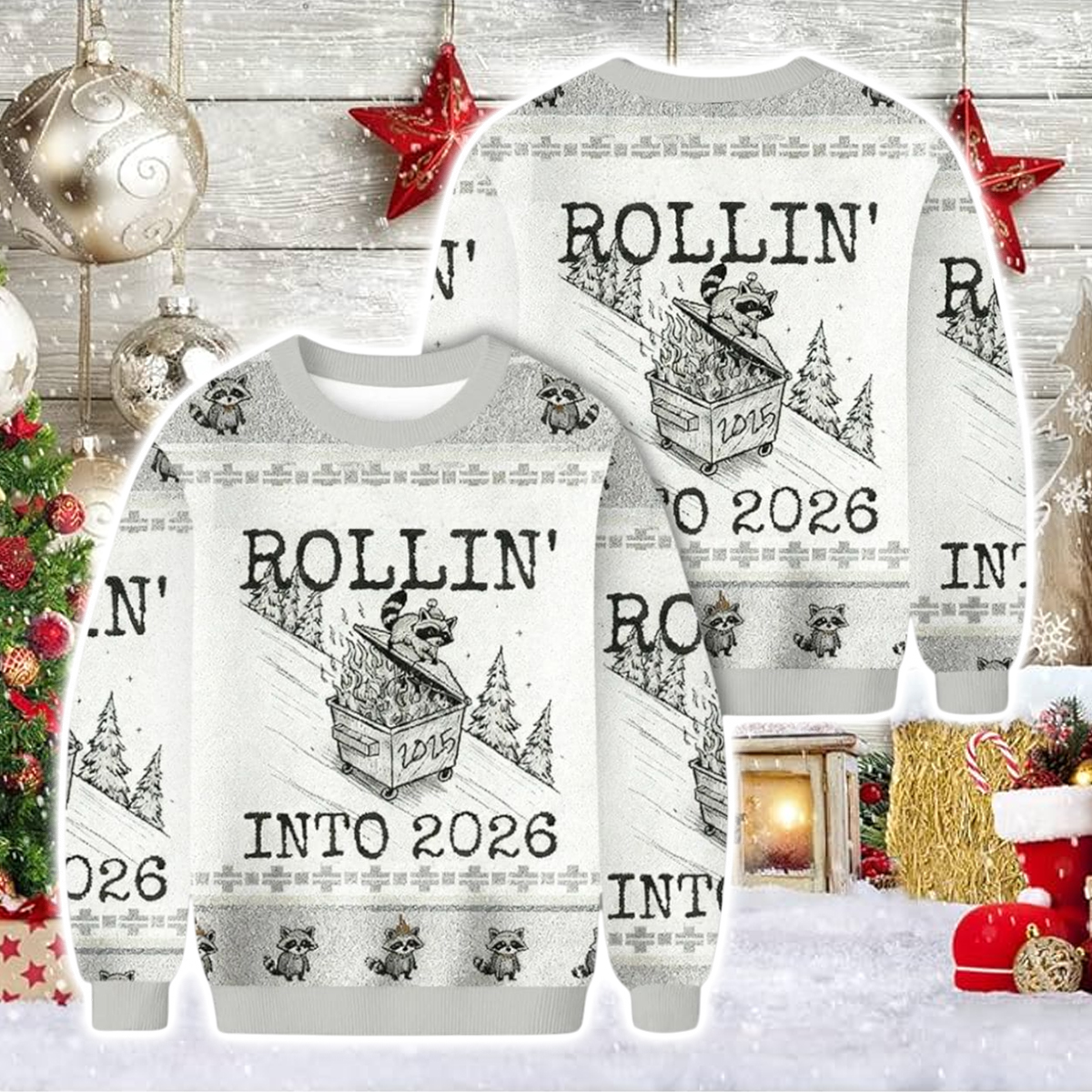 Funny Raccoon Rollin’ Into 2026 Christmas Ugly Sweater