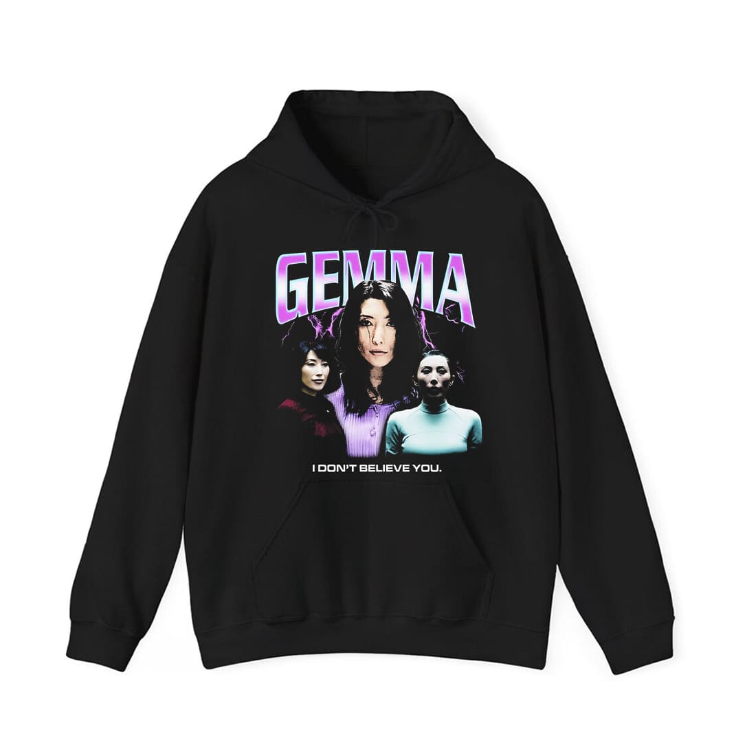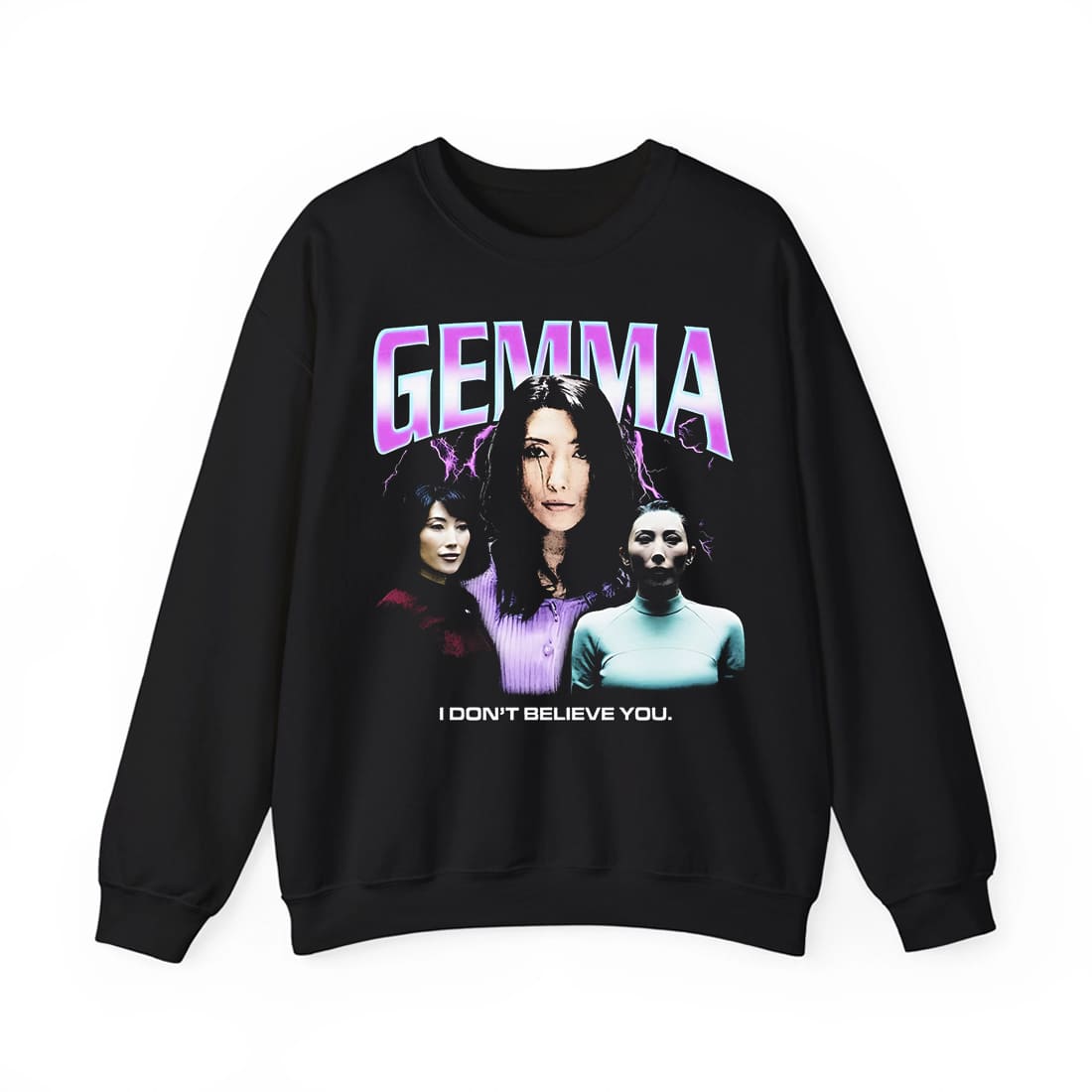 This comfy black cotton tee features Gemma Chan’s intense portraits center in purple, flanked by darker silhouettes set against lightning bolts. “GEMMA” glows in pink and purple neon above, with “I DON’T BELIEVE YOU” in white below. It’s stylish, casual, and ideal for fans and everyday wear.