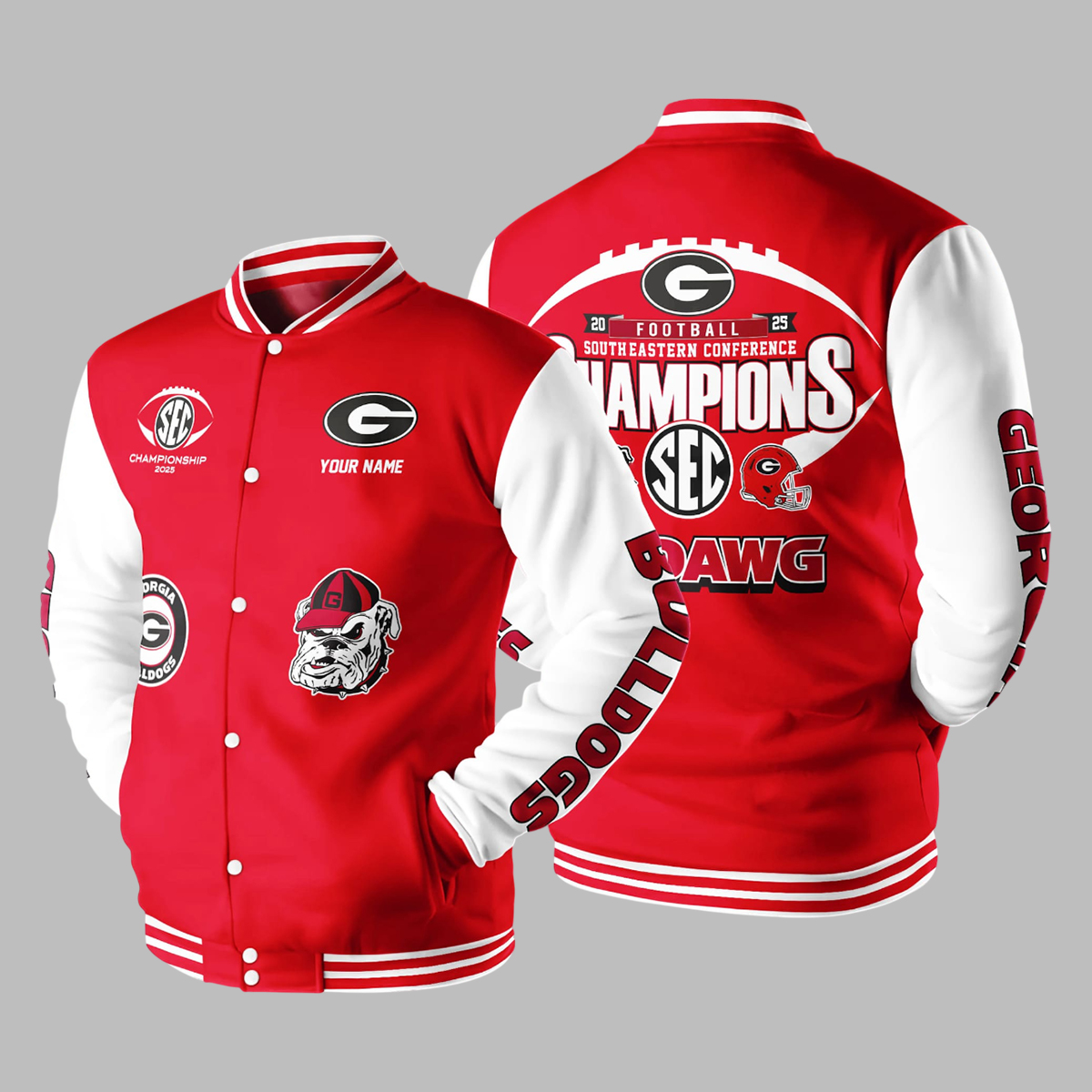 This jacket features a striking red body paired with crisp white sleeves, instantly recognizable and full of team spirit. The front includes multiple detailed graphics: the SEC Championship 2025 emblem, the bold Georgia “G” logo, a customizable “Your Name” section, and a powerful bulldog mascot illustration across the lower left. Both sleeves carry “GEORGIA BULLDOGS” text along with additional team patches that elevate the visual impact from every angle. On the back, a large championship layout dominates the design, proudly displaying “2025 Football Southeastern Conference Champions,” the SEC symbol, and a helmet graphic that ties everything together. It’s loud, proud, and designed to celebrate one of the program’s most electrifying achievements.
