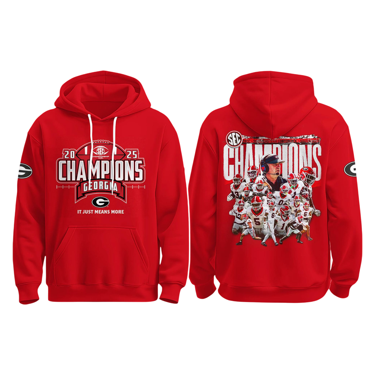 This hoodie features a bold Georgia-red base with championship artwork printed on both the front and back. The front design showcases a large “Champions 2025” badge centered around a football graphic and the Georgia “G” logo, paired with the phrase “It Just Means More,” capturing the passion behind SEC football. On the back, the hoodie becomes an even more powerful statement piece, displaying a dynamic collage of Georgia players charging forward, led by their coach, all set beneath a massive “Champions” headline. The imagery radiates intensity and emotion, visually echoing the adrenaline-filled moments of the SEC title game. Both sleeves також highlight the iconic Georgia “G,” adding depth and balance to the overall design.