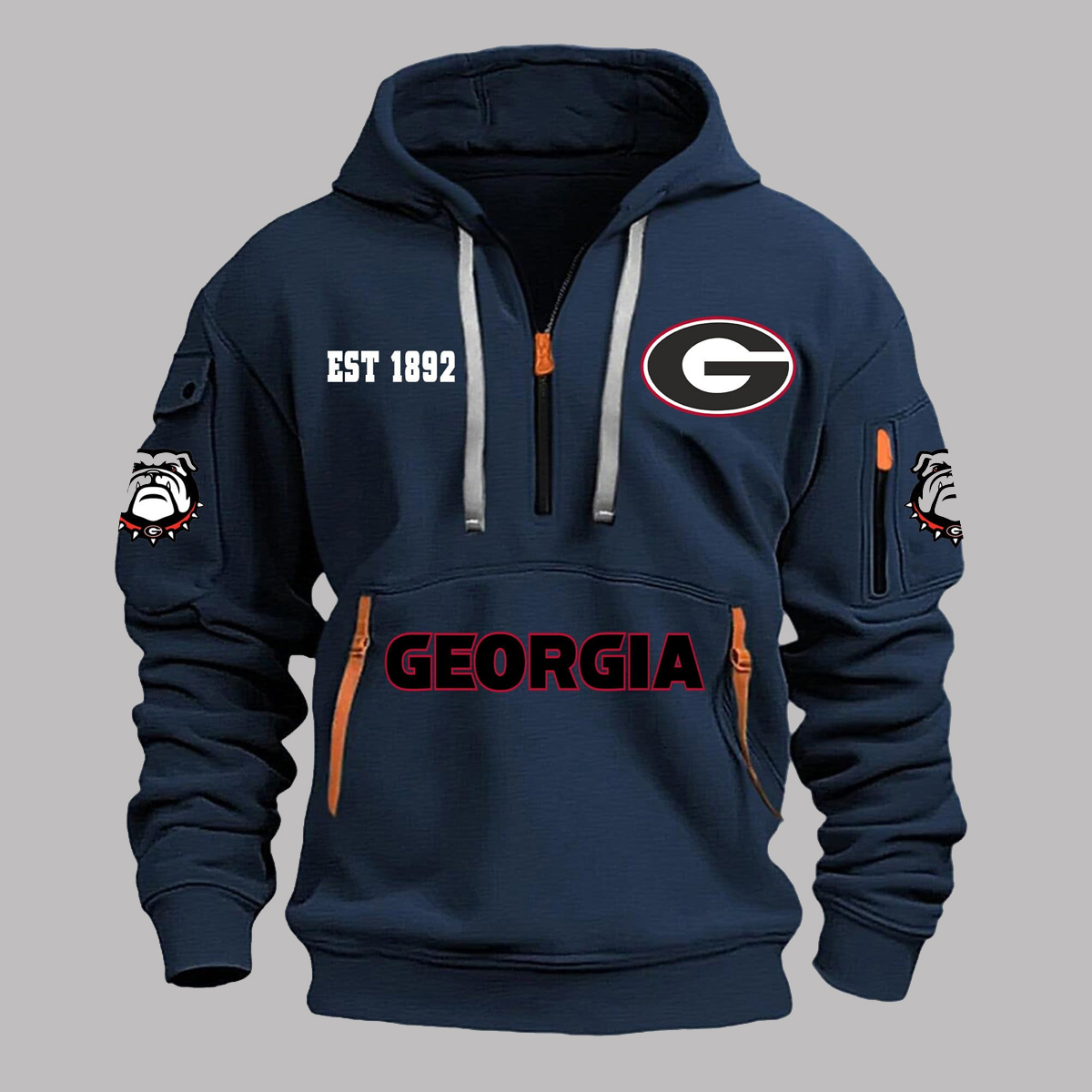This hoodie gained attention during several 2025 fan meetups celebrating program history, where supporters wore heritage-styled apparel honoring the founding year. The design features a deep navy base contrasted with sharp white, red, and charcoal details. On the chest, EST 1892 stands proudly beside a large Georgia-inspired “G” emblem, highlighting more than a century of tradition. The word GEORGIA stretches across the front pocket area in bold red-outlined lettering, creating a strong visual anchor. Both sleeves feature a fierce bulldog graphic, giving the hoodie a spirited, energetic edge. Orange zipper trims add a modern tactical touch, making the hoodie eye-catching and contemporary.
