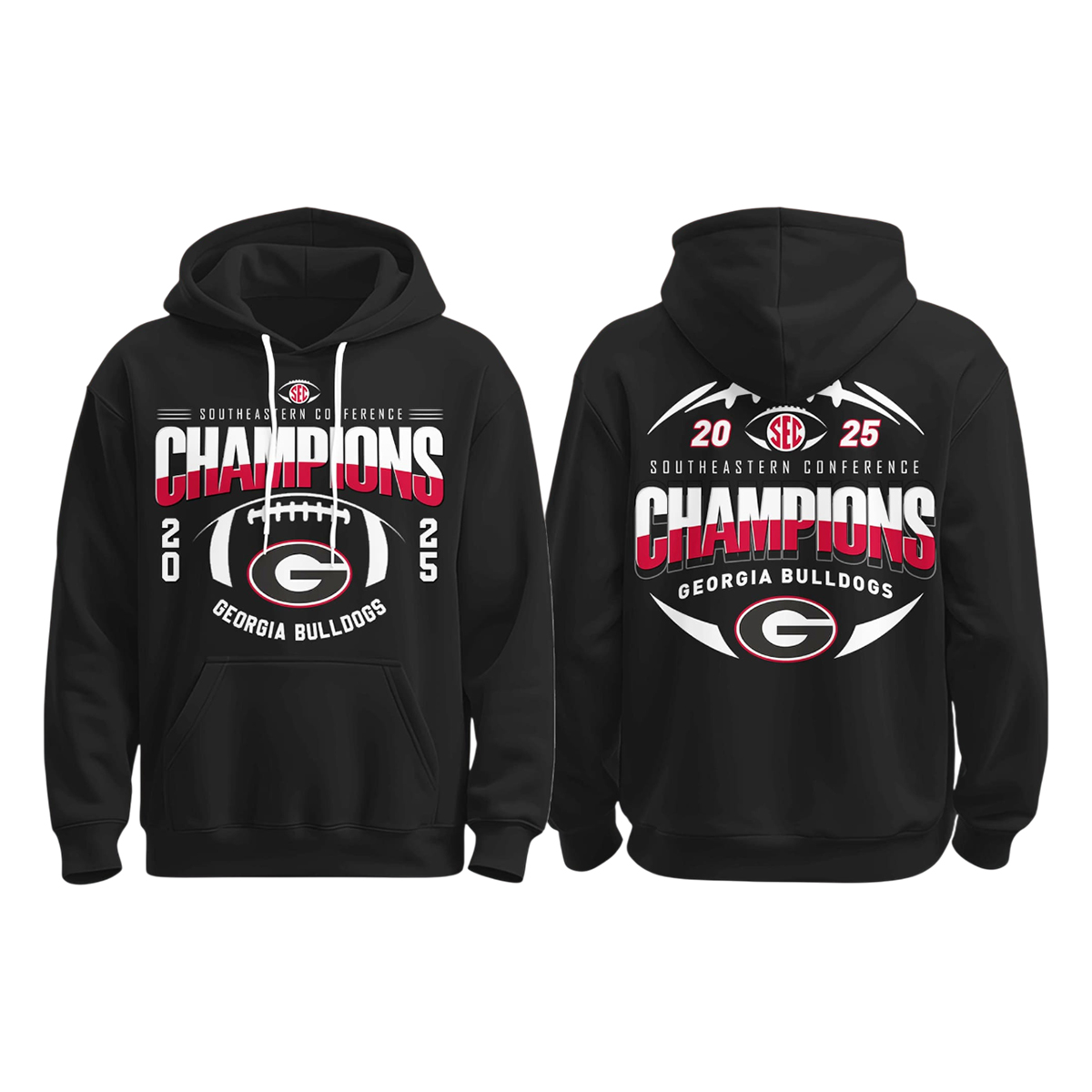 This hoodie features a sleek all–black design with striking red, white, and gray graphics printed boldly on both the front and back. The front showcases a large “Champions” banner in layered red-and-white lettering, framed by “Southeastern Conference” at the top and the championship year “2025” placed vertically on each side. Beneath it sits a football graphic accented with the iconic Georgia “G” logo, making the design instantly recognizable. On the back, the artwork expands into a full championship crest, featuring the SEC badge, the year, and a powerful mirrored football graphic that frames the lettering. The clean layout, bold colors, and balanced composition make this hoodie visually powerful and deeply connected to the spirit of the Bulldogs’ 2025 championship run.